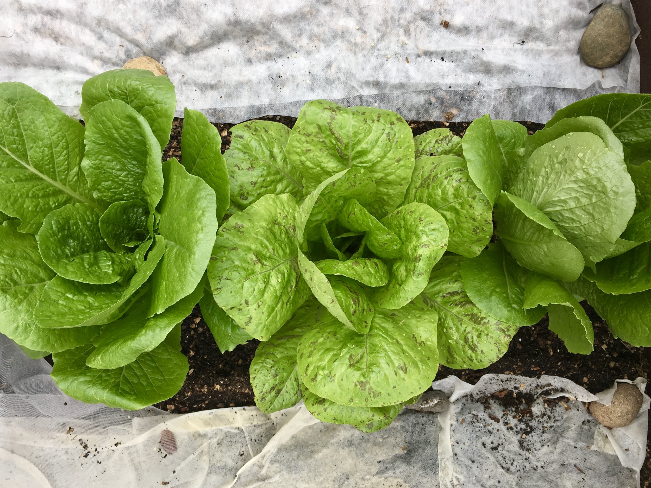 Romaine lettuce from transplants with seeded lettuce nearby.