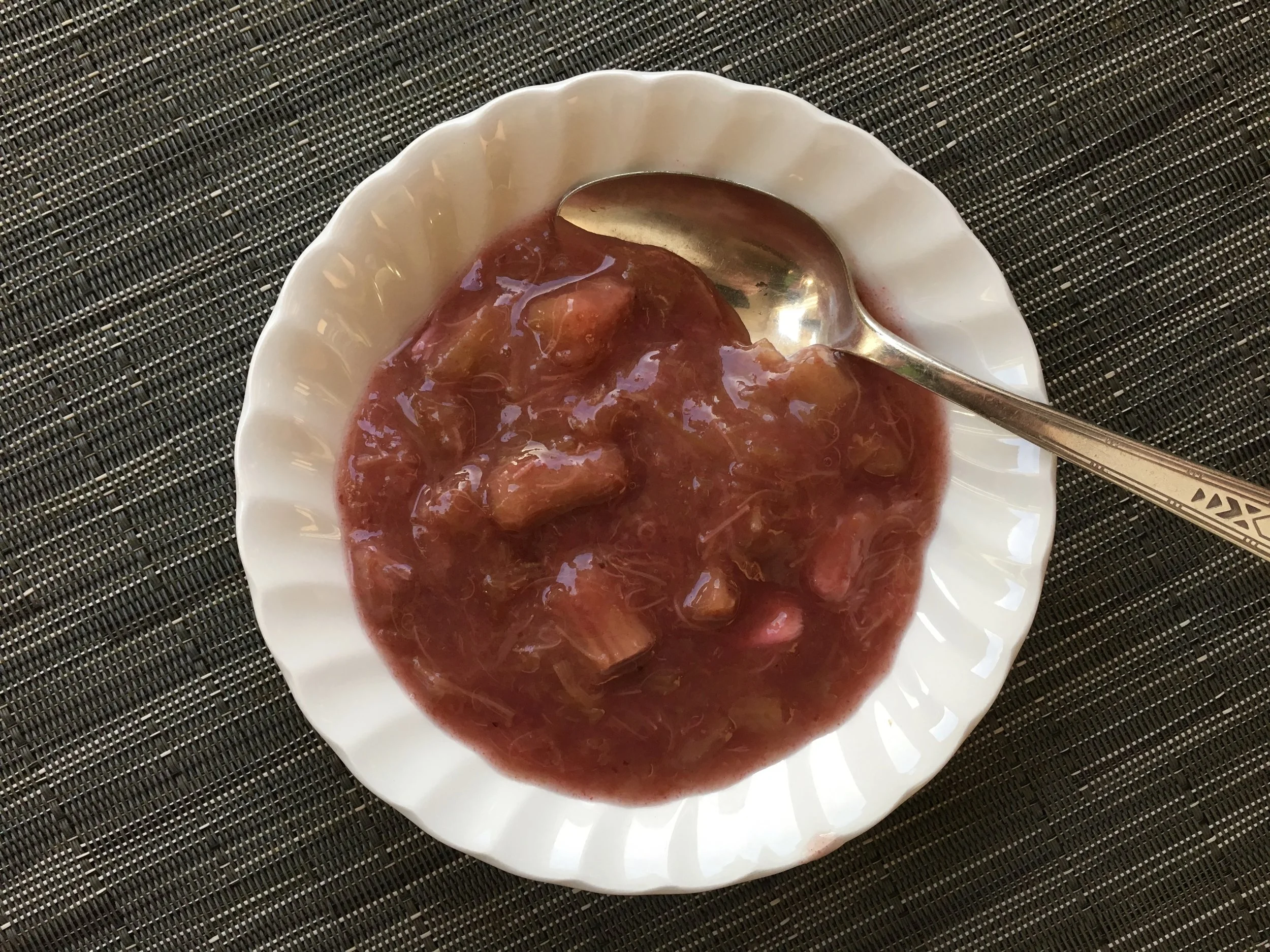 Guava puree adds color to the dreary rhubarb compote and gives it a flavor kick.
