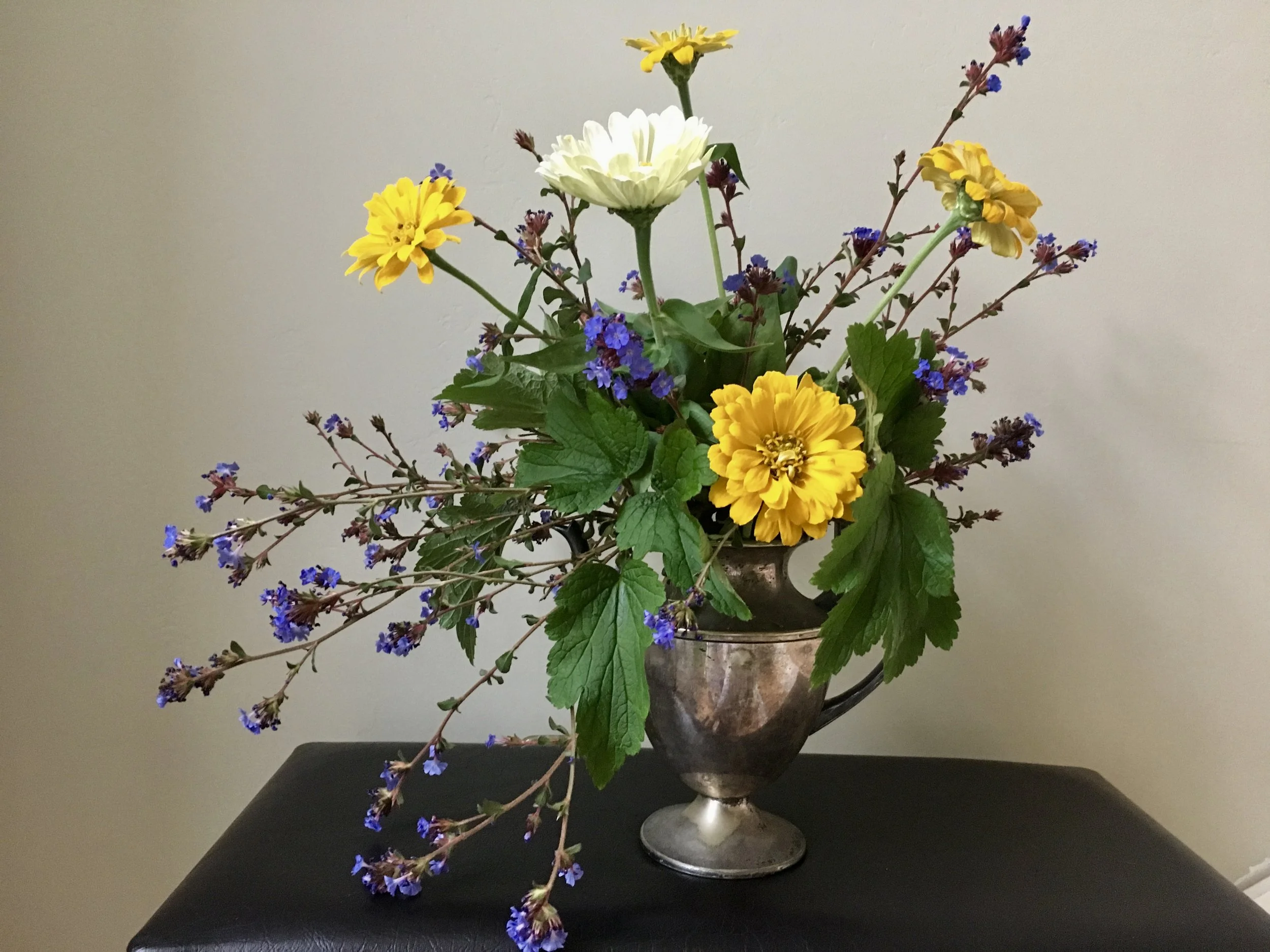 There are other ongoing harvests but I’ll save for next week and close with a bouquet from my garden. Zinnias are in with the vegetables. Blue flowers are ceratostigma plumbaginoides which is very drought tolerant and blooms about eight months of the year in my coastal garden.