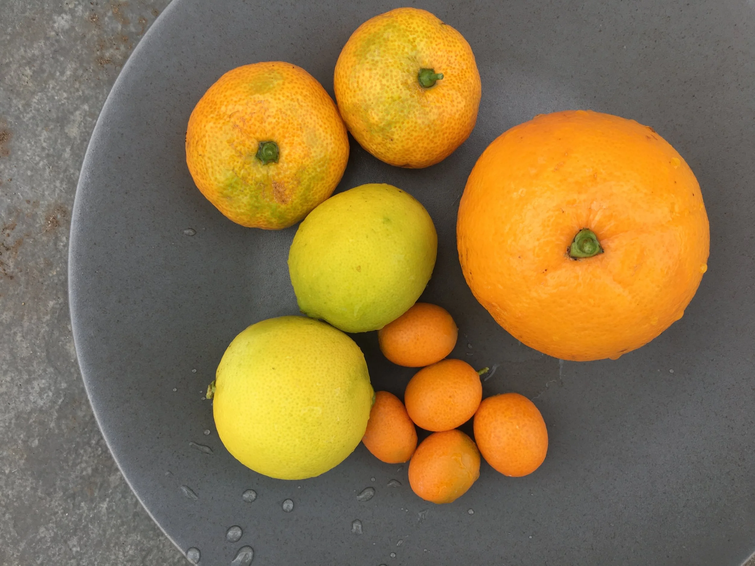 A citrus sampler shows what we continued to harvest this past week. Lots of orange juice, tangerines at lunch and soon there will be kumquat marmalade.