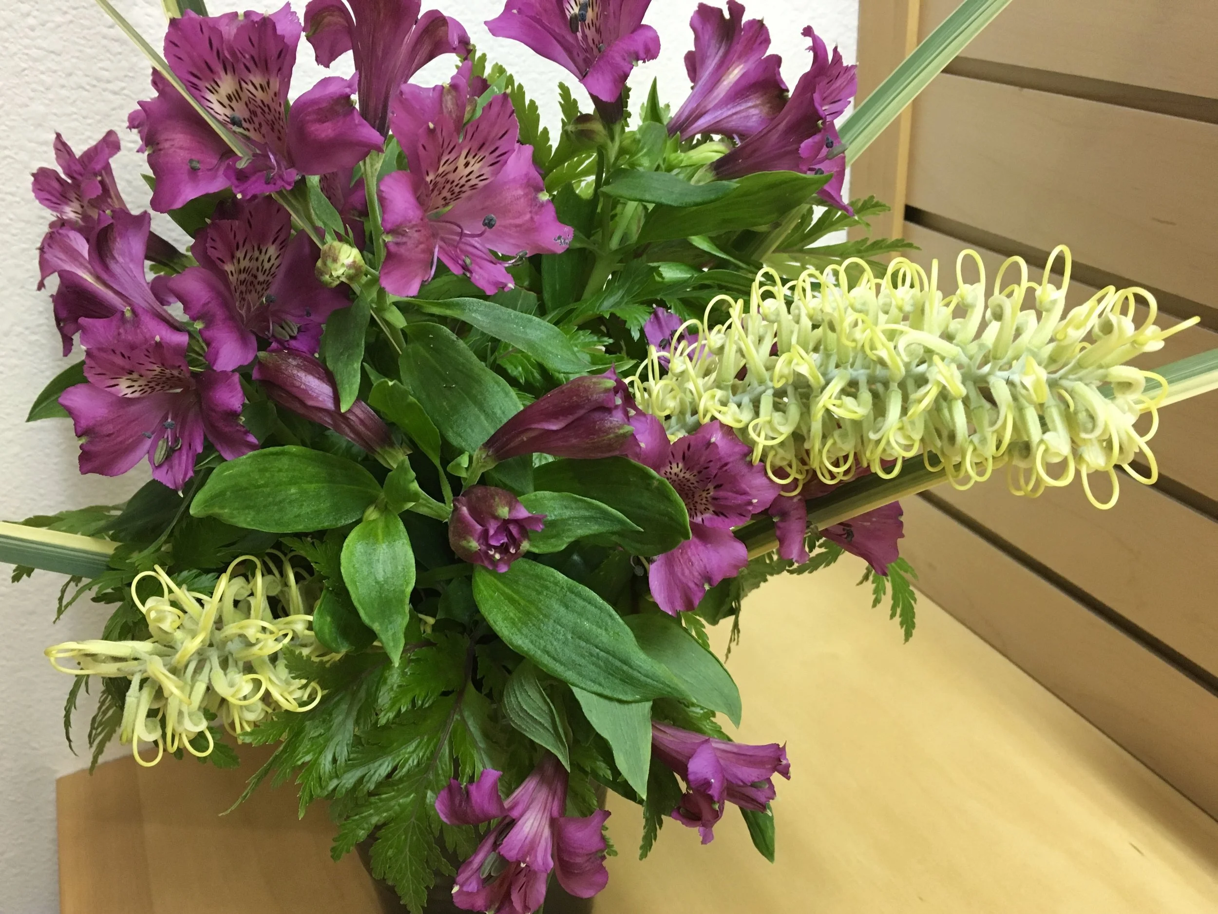 ‘Moonlight’ grevellia, alstroemeria, geranium leaves and dietes.