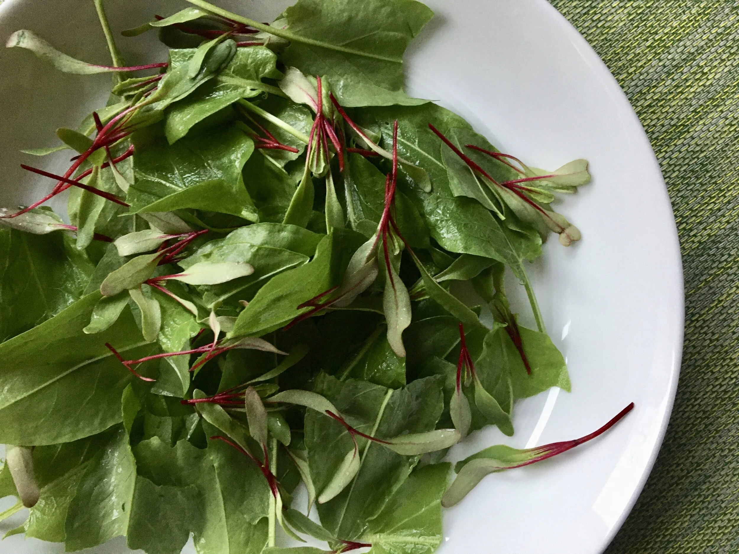 A certain sign of the changing seasons in the garden—the beet thinnings, snipped and washed became micro-greens for salads.