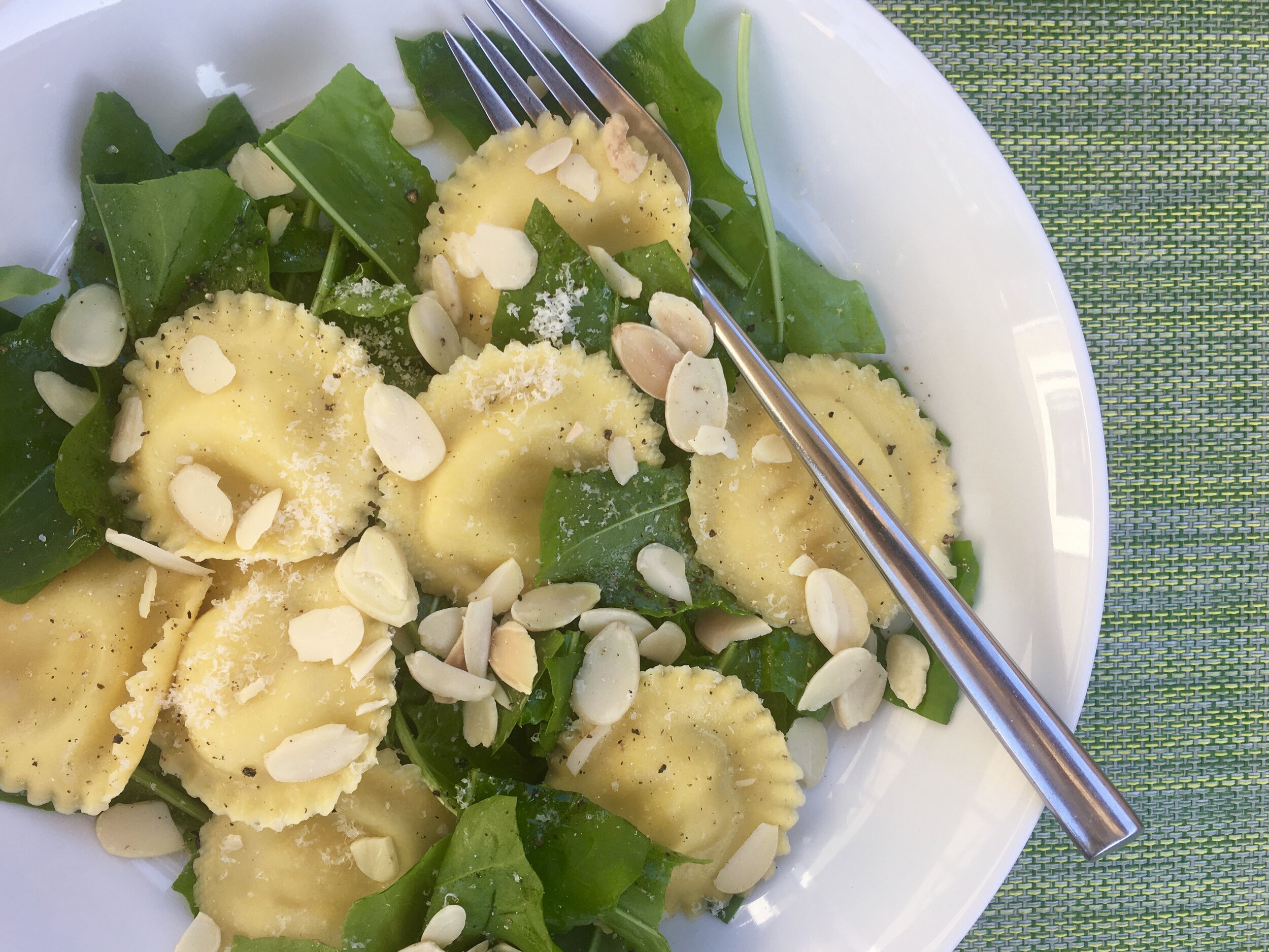 Here, the French sorrel subbed for arugula with Trader Joe’s Lemon Ricotta Ravioli. Fresh lemon juice and EVOO brought all the flavors together.
