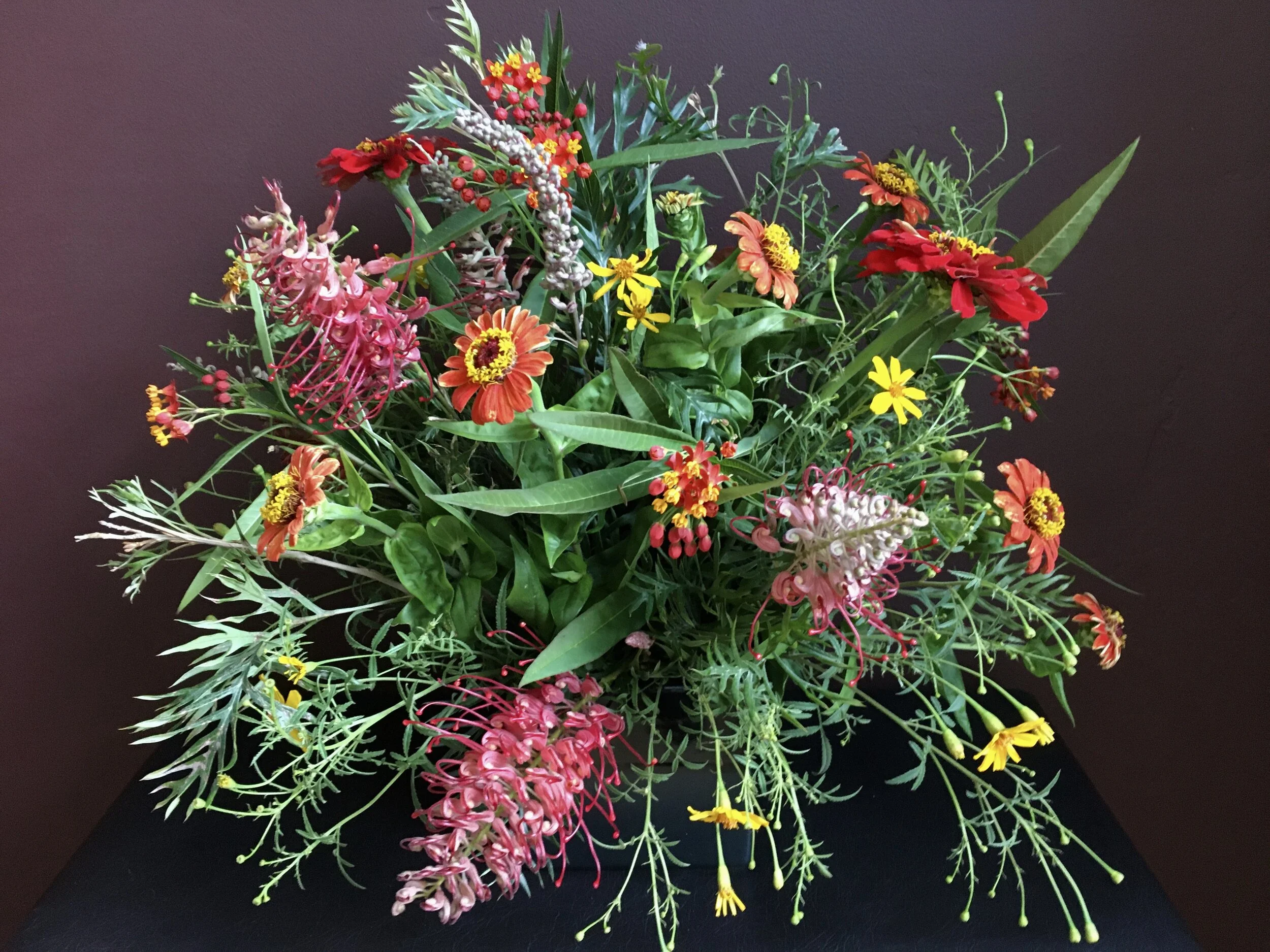 Sunday’s church bouquet suggests a joining of the summer and fall flower gardens. Zinnias and milkweed linger while Mexican marigold begins its autumn run.
