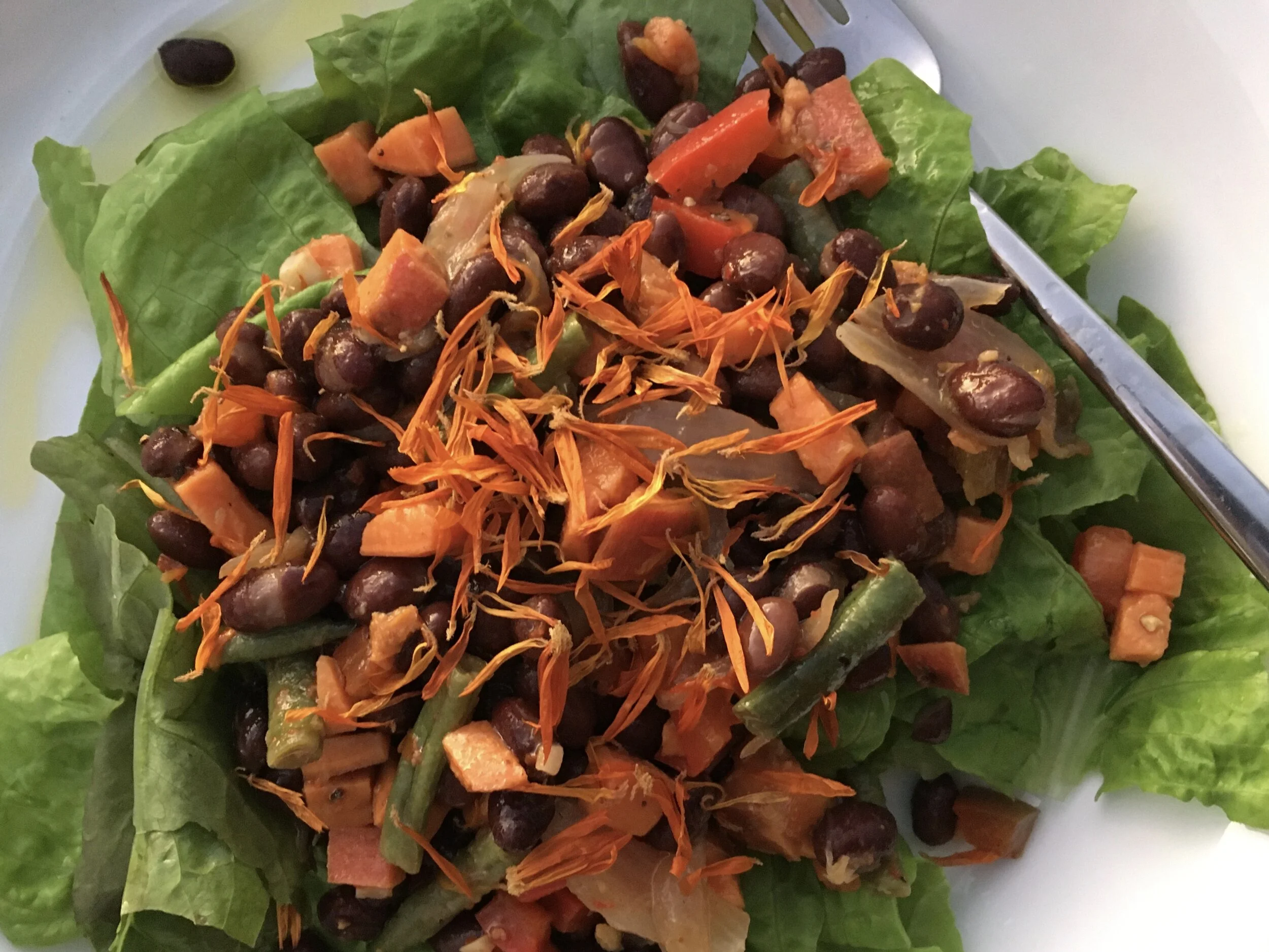 Here’s one of my hearty salads with garden lettuce, green beans, bell peppers and red onions. Scattered on the top are dried calendula petals from last year’s edible flower harvest.