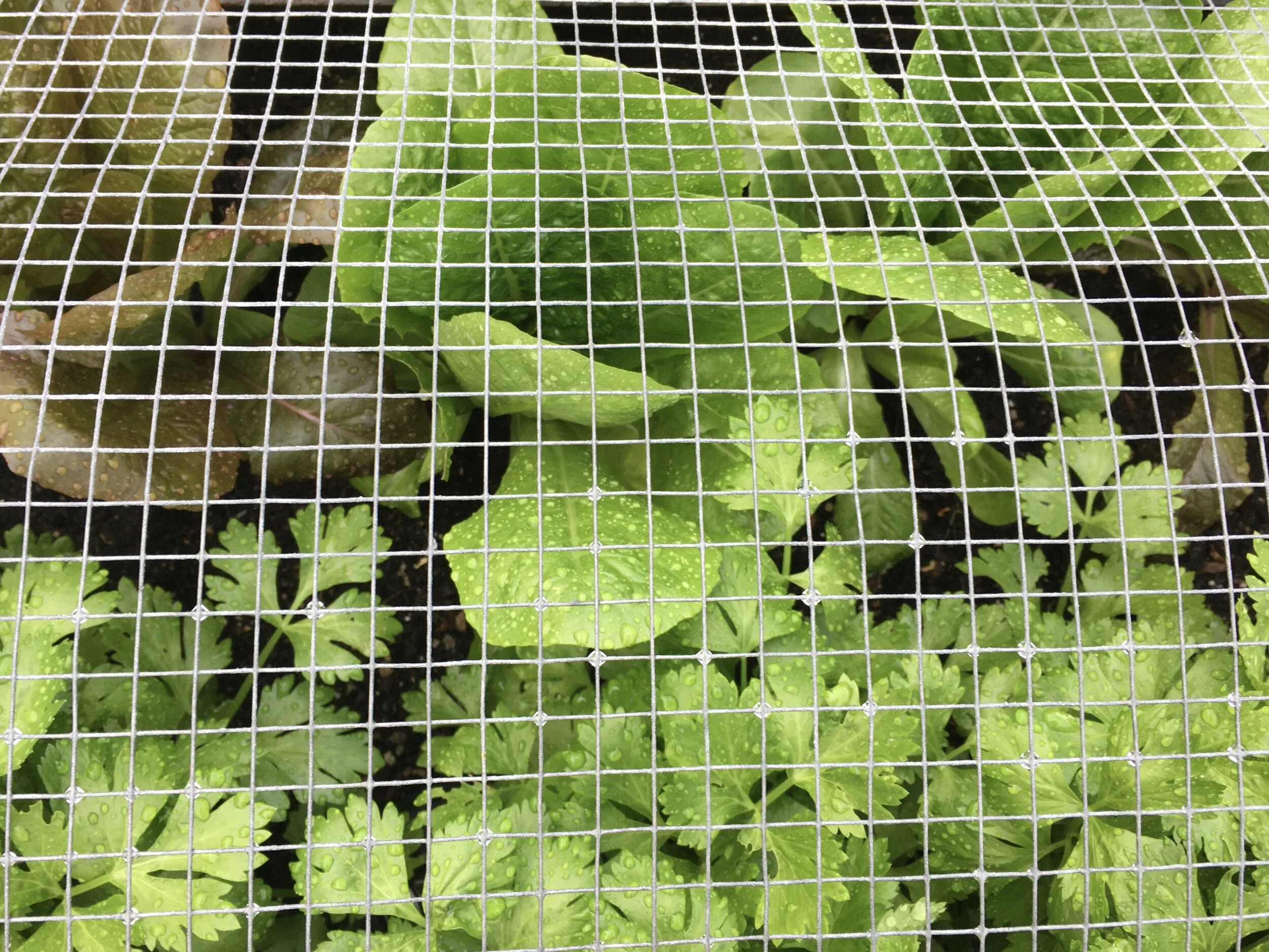 Lettuce and celery under a screen to protect the lettuce from snacking birds.