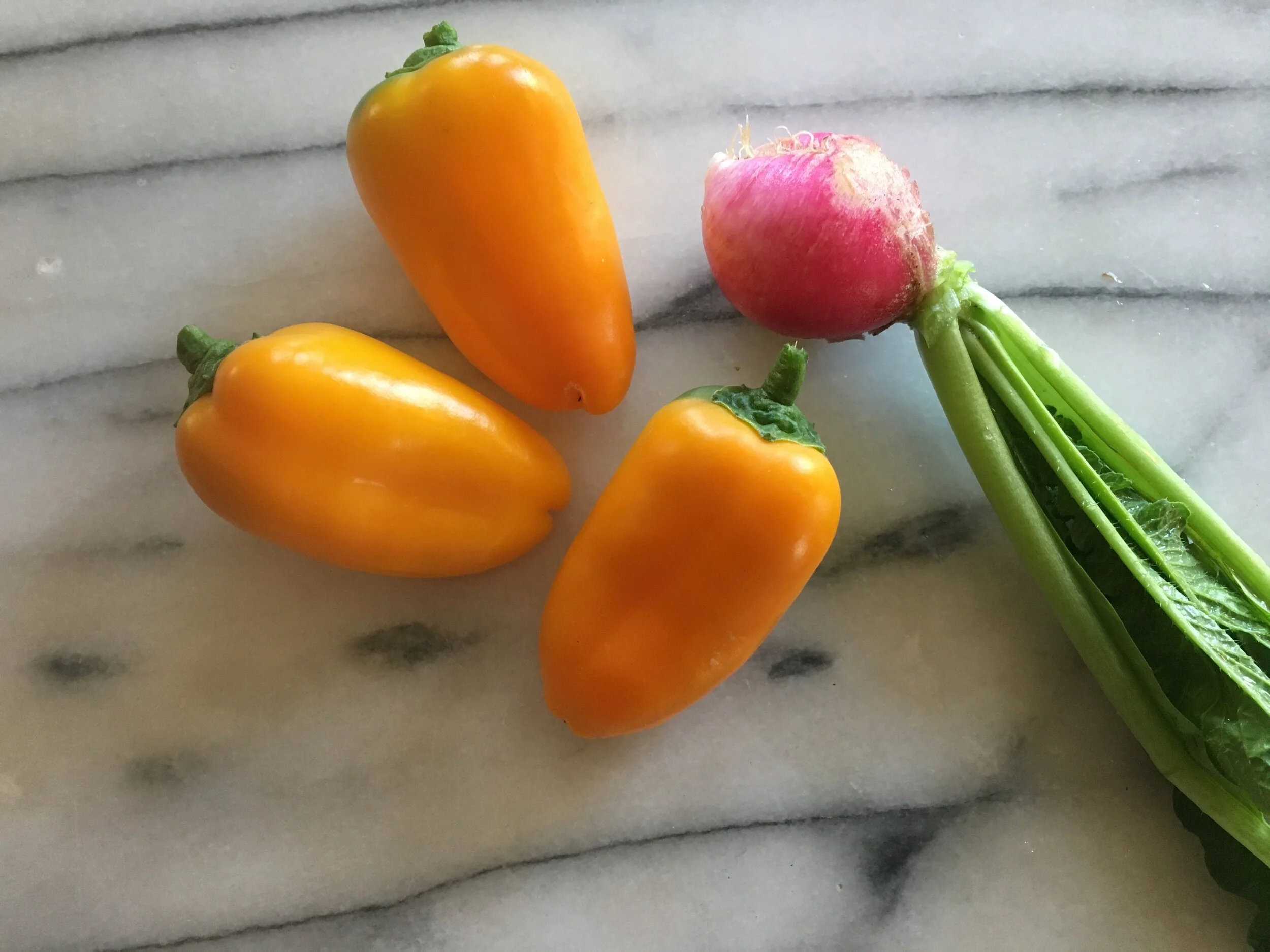 The ‘Baby Belle’ peppers and ‘Red Beauty’ bell peppers seem undaunted by the chilly nights. I’m picking some of them green, though I’m eyeing one that is almost all red. Some of the radishes planted about five weeks ago will be ready soon. Here’s the first of ‘Easter Egg II.’