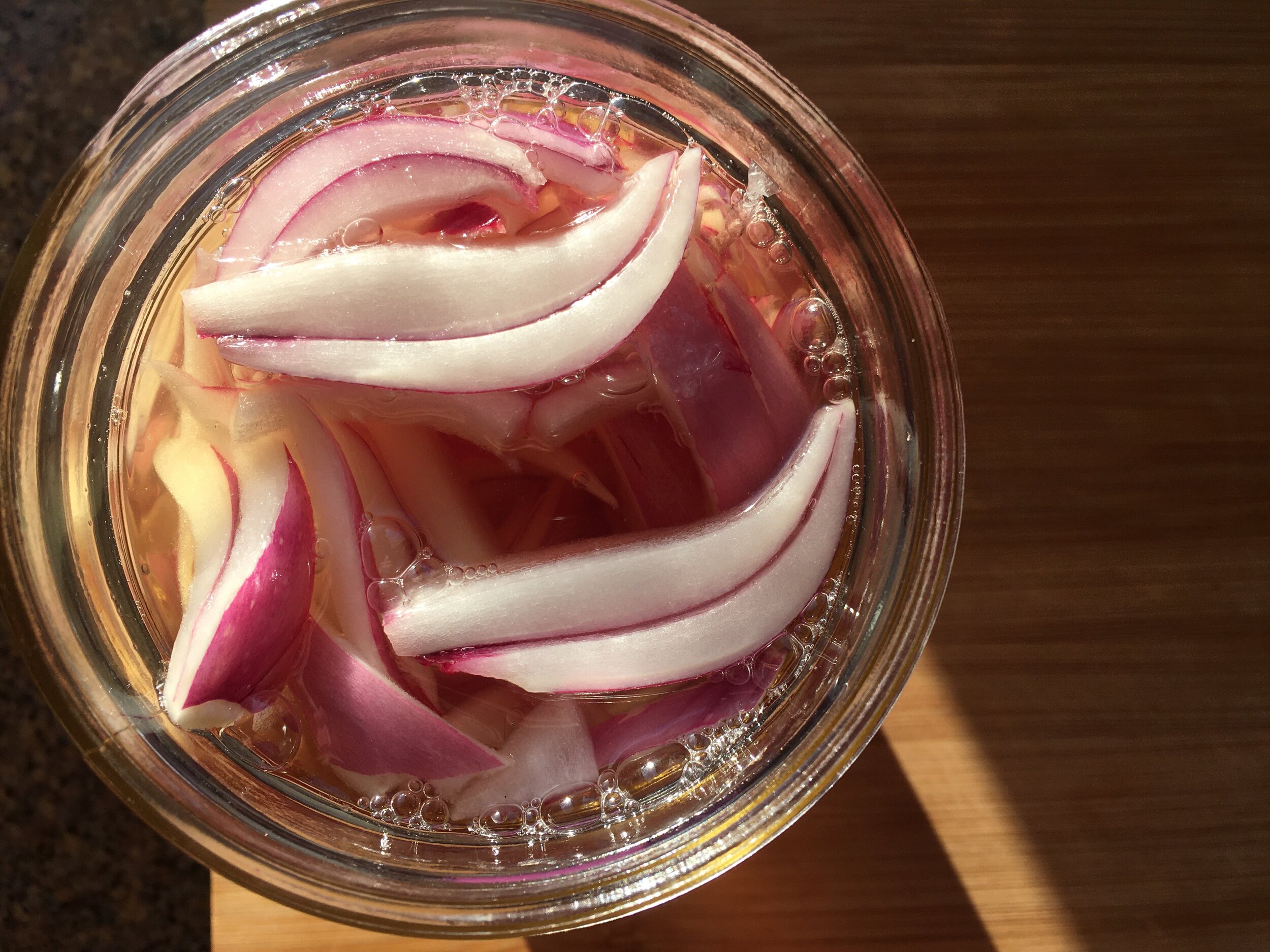 I’ve decided that pickled red onions are essential to have on hand so I pulled one of my stored red onions to make another round.