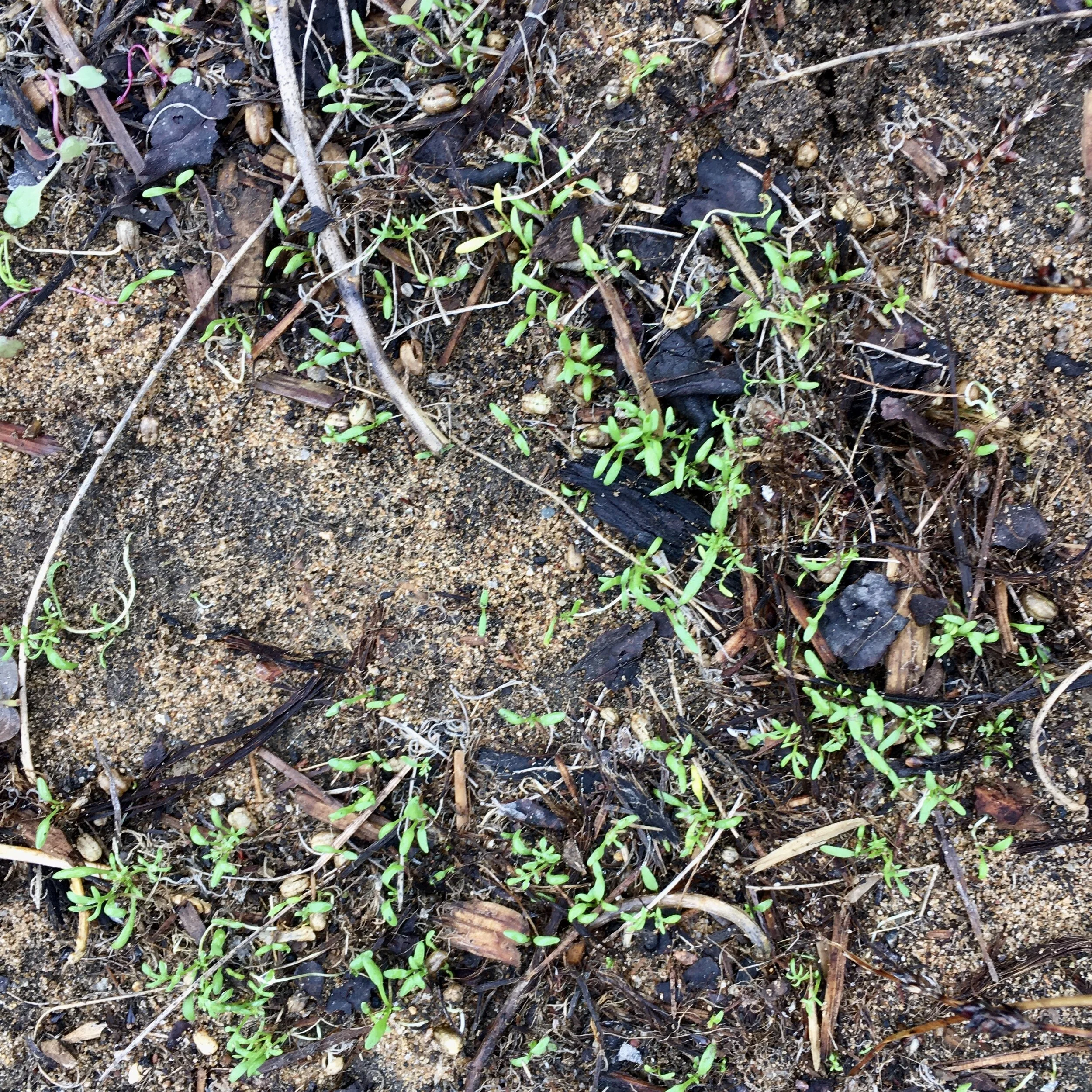 Gilia tricolor seedlings in my native plant garden.