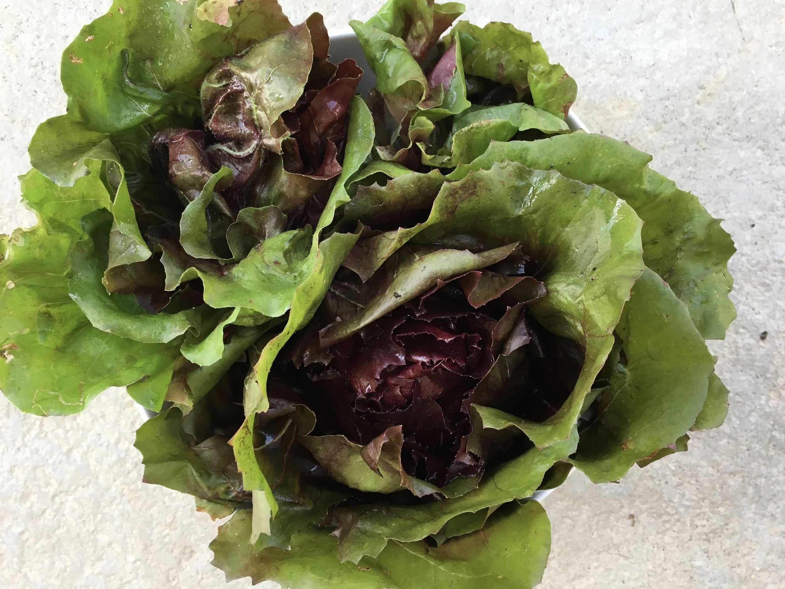 My husband holds a huge head of lettuce harvested from the garden last week. Lettuce weather continues for us in San Diego. It’s been a cool May with intermittent light showers. No hot days that hasten bolting. ‘Jericho’ lettuce, a warm weather romaine selection from Israel has performed perfectly in the late spring garden. I will try to do successive plantings from seed transplanted to the garden for summer salads.