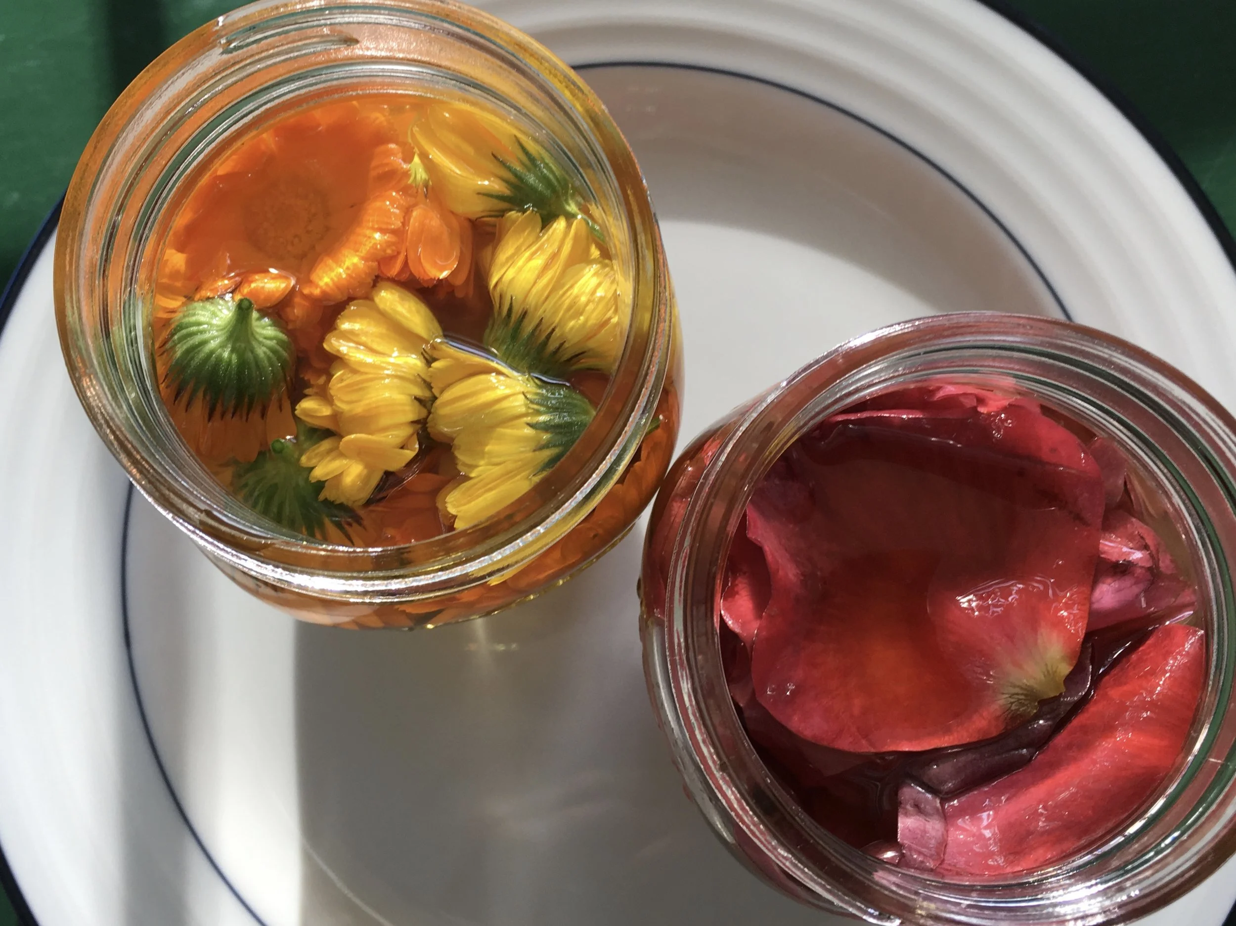 Along with lettuce and spring onions, my suitcase to Seattle included pint jars of calendula flowers and rose petals. TSA decided these were not a threat this time. No little notes of inspection in my suitcase. We made calendula- and rose-infused essential oils using a mix of almond and avocado oils. Instructions in Harvest: Unexpected Projects Using 47 Extraordinary Garden Plants .
