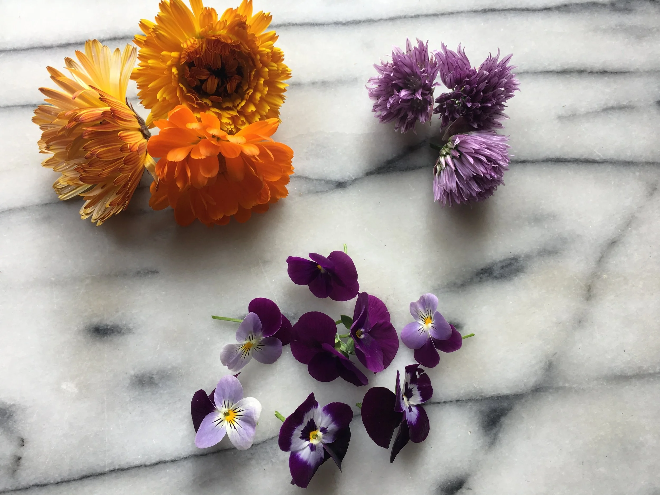 When garden harvests are a bit thin, there are usually edible flowers and herbs to add interest to purchased food.
