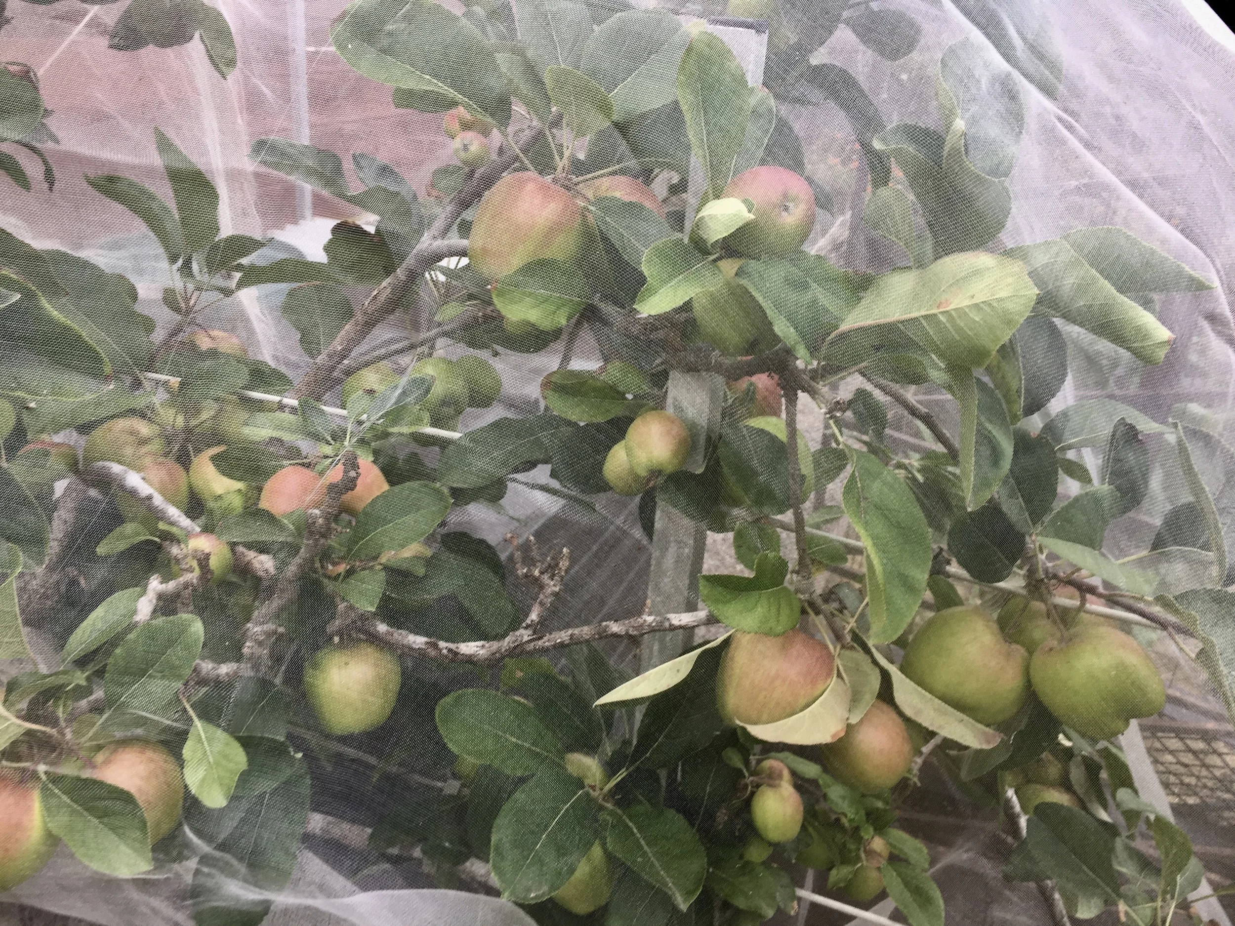 The ‘Dorsett Golden’ apple crop is coming in. It’s a bit of a race with rodents. I picked some earlier in the week and these today. As I selected them, I saw four that had been gnawed. Traps are set, again. Tomorrow we plan to uncover the espaliered tree and harvest what we can.