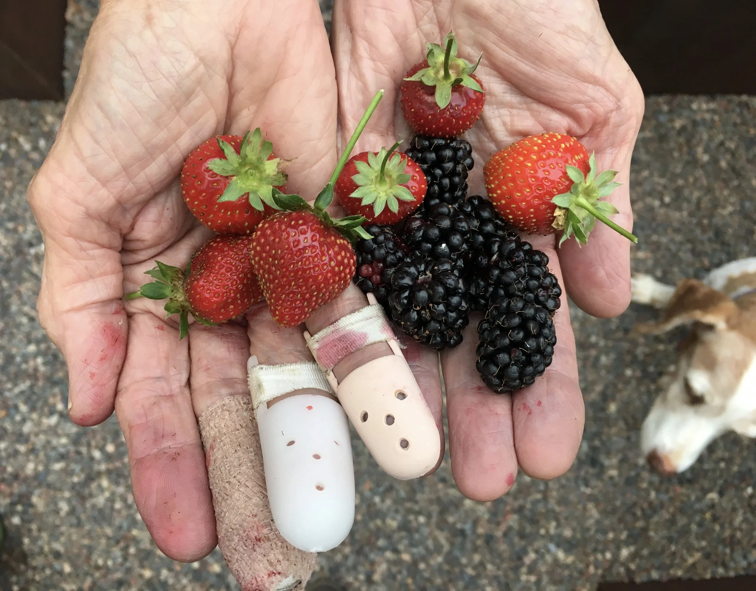 Gardening has been a bit awkward and much slower with three broken fingers. I tripped on a city sidewalk while admiring a garden instead of watching my feet. A last minute gathering of the berries for dinner added some color to my dressings.