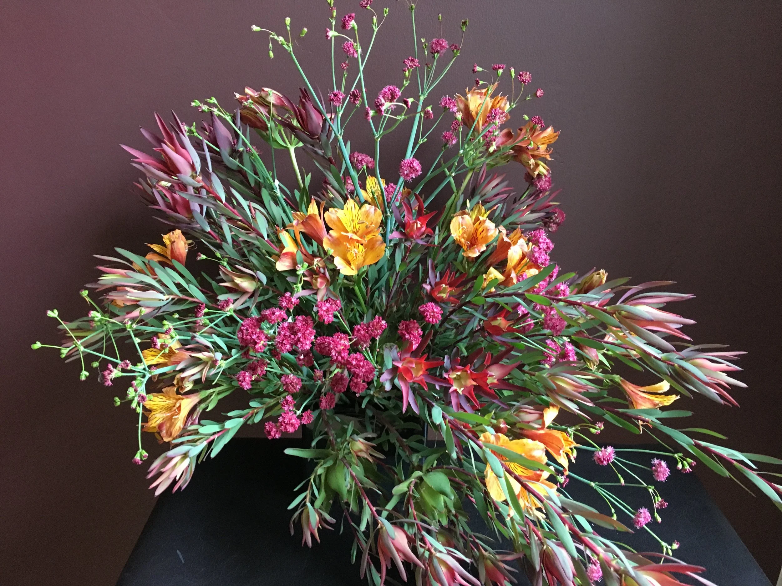 And I’ll close with the Sunday bouquet for church with leucadendron, red buckwheat and alstroemeria.