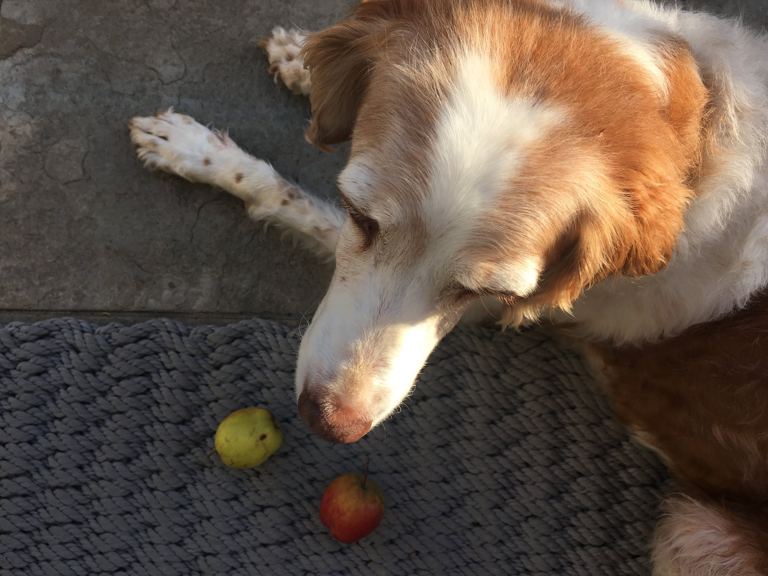 Lucy considers it her Brittany duty to bring the drops to the kitchen door. She and her breed would remind us that she both points (at birds) and retrieves.