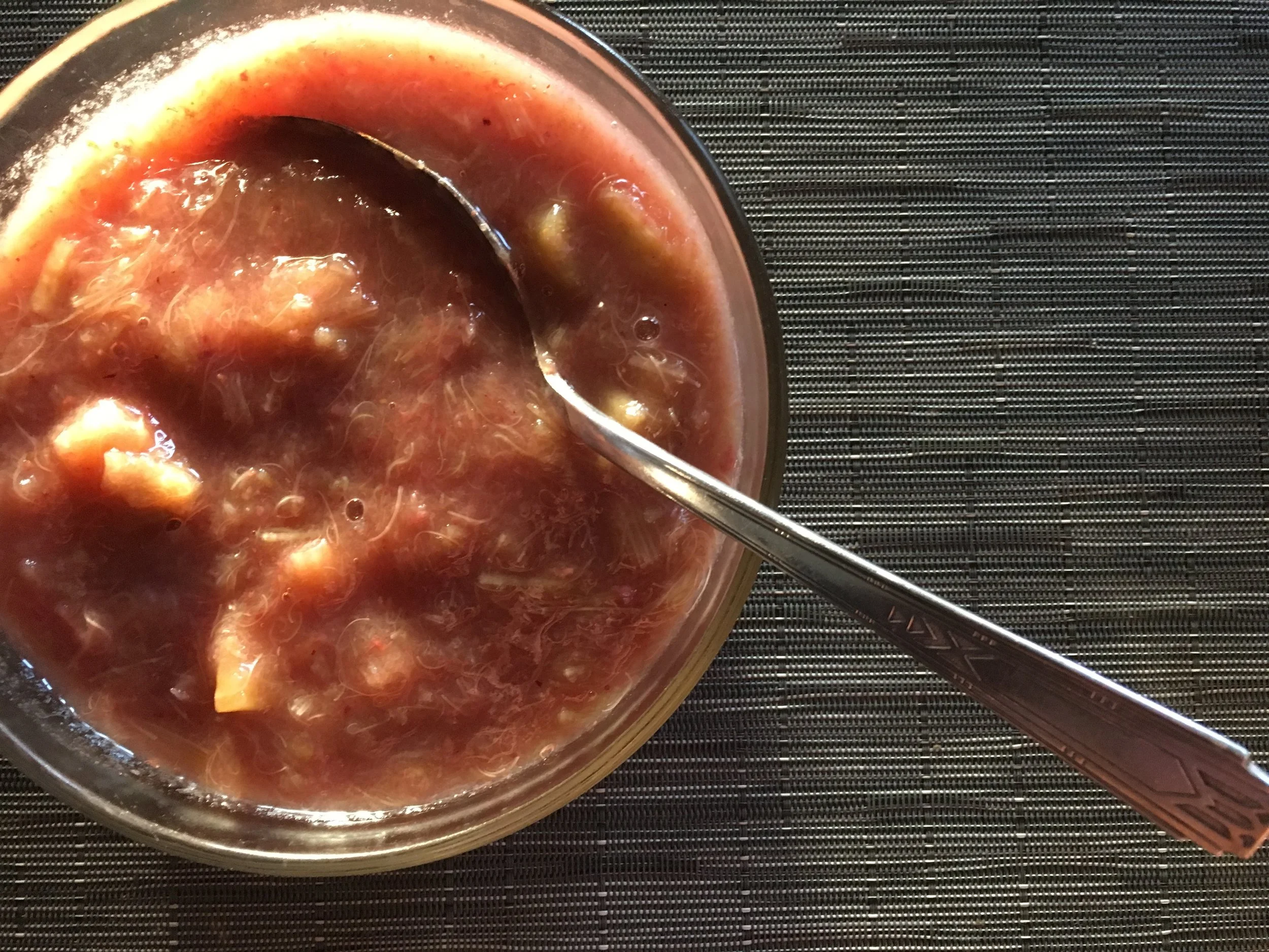 When the rhubarb and apples have cooked down I add frozen strawberry guava puree which gives the compote a pinkish hue. Most of the sauce went to the freezer but we savored the first of the season at dinner over the weekend. That’s my grandmother’s fruit spoon.