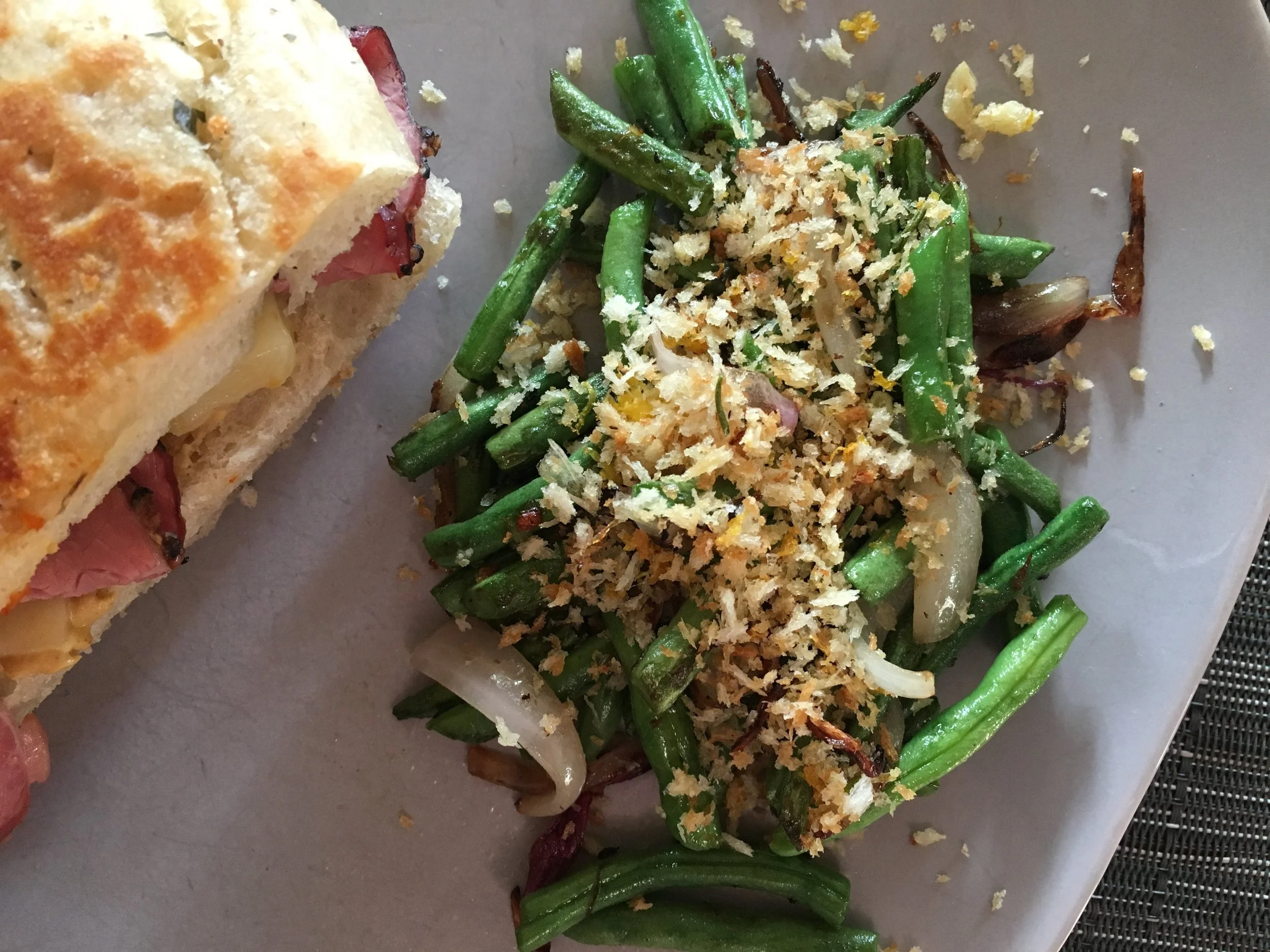 I keep toasted flavored panko crumbs on hand to top veggies. The lemon zest, garlic and rosemary add fabulous flavor to the green beans.