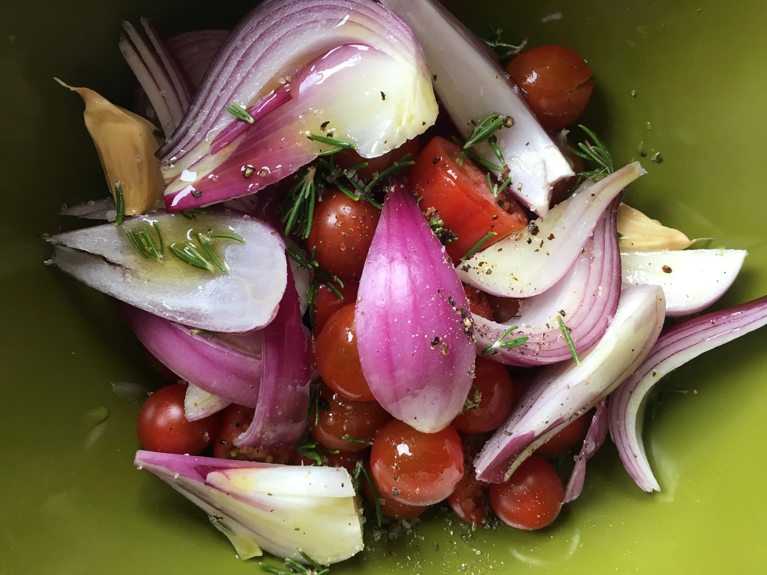 I took the salvaged portions of the ‘San Marzano’ tomatoes, cherry tomatoes, red onions and roasted them together with olive oil and rosemary. Part way through the roasting time I added my first zucchini to the veggies.