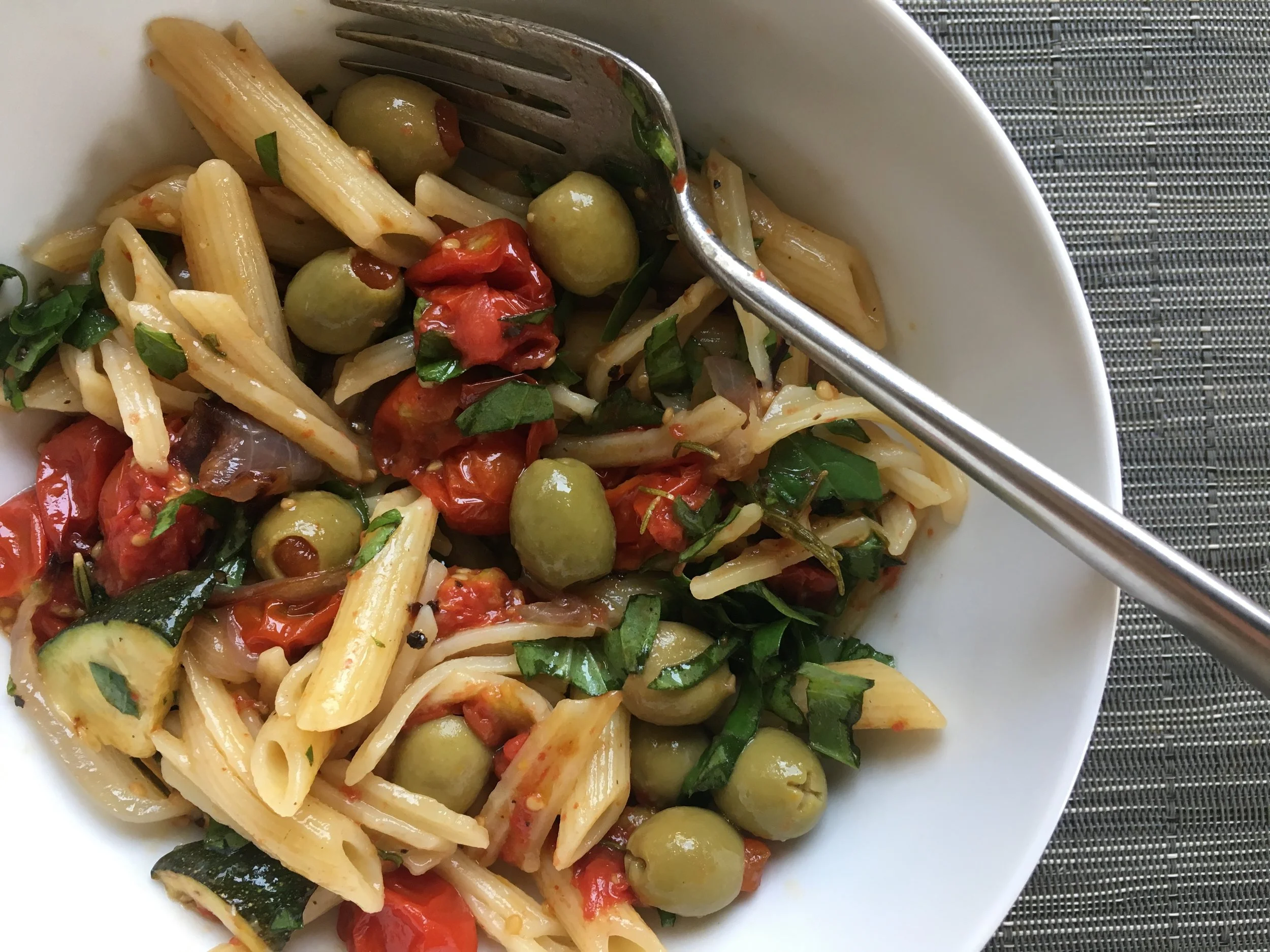 The roasted vegetables combined with cooked pasta, a little pasta water and basil strips made an easy summer entree from the garden.