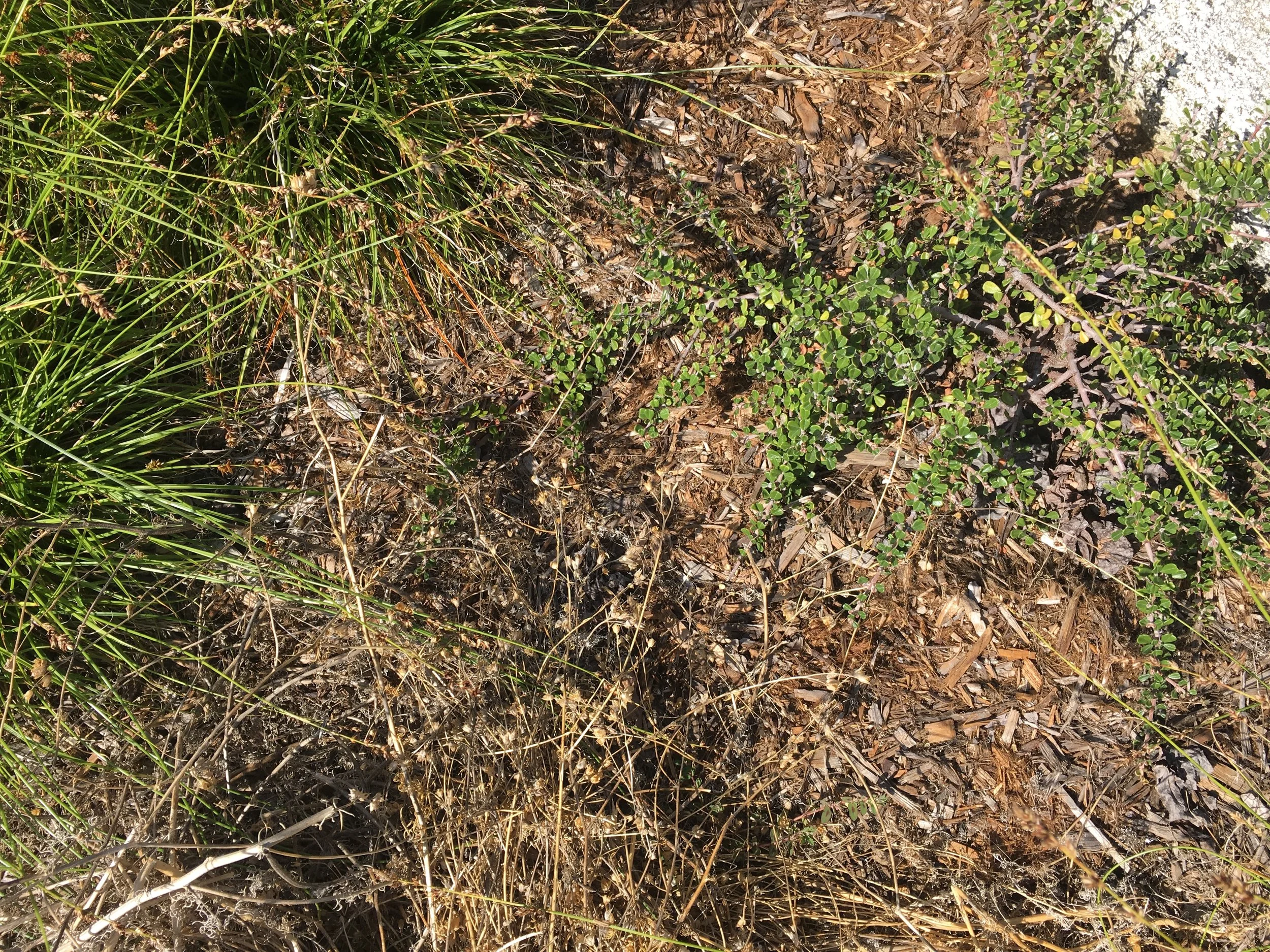 Annual Gilia tricolor setting seed for next year’s bloom. Ceanothus ‘Point Sierra’ persists through the summer with little water.