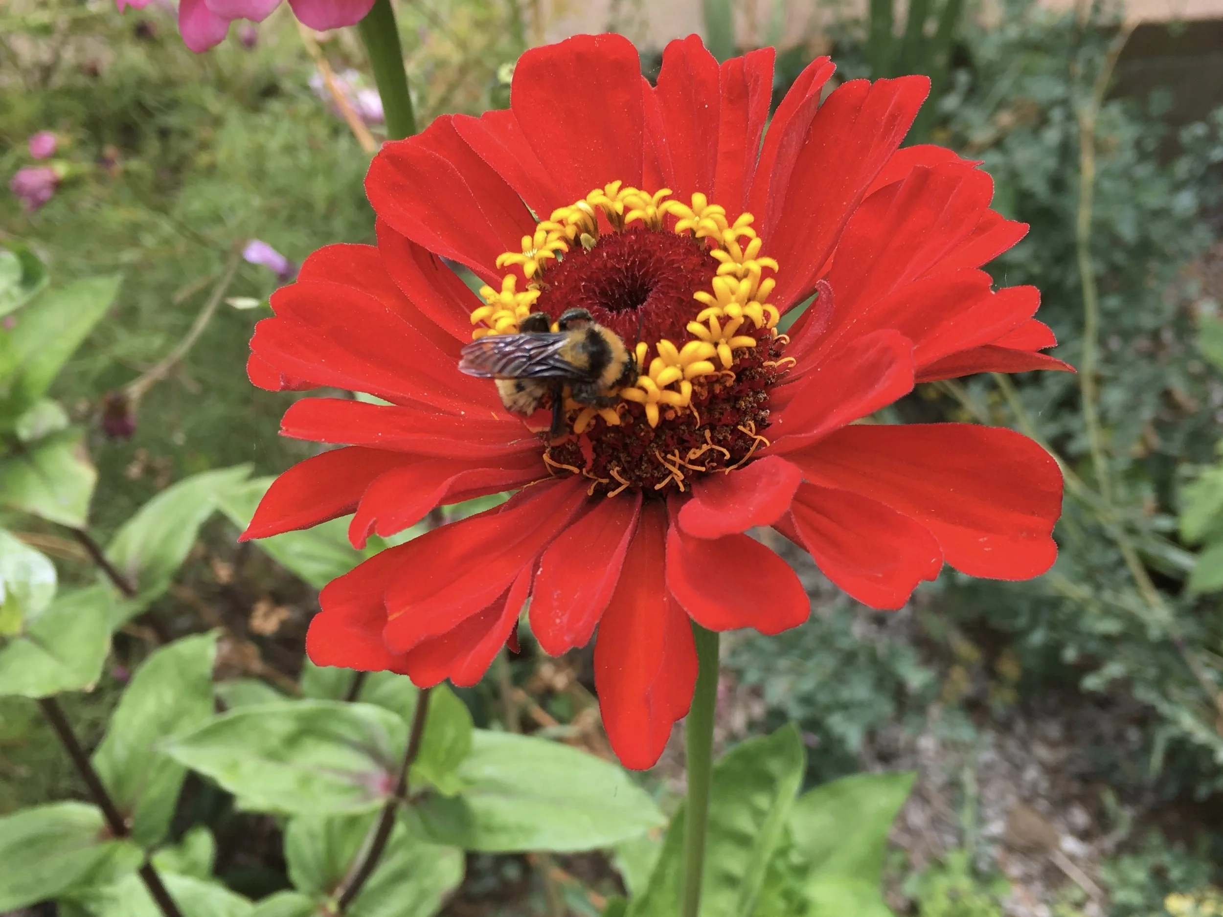 Zinnia and a bumble bee. The bumble bees often sleep on the zinnias.