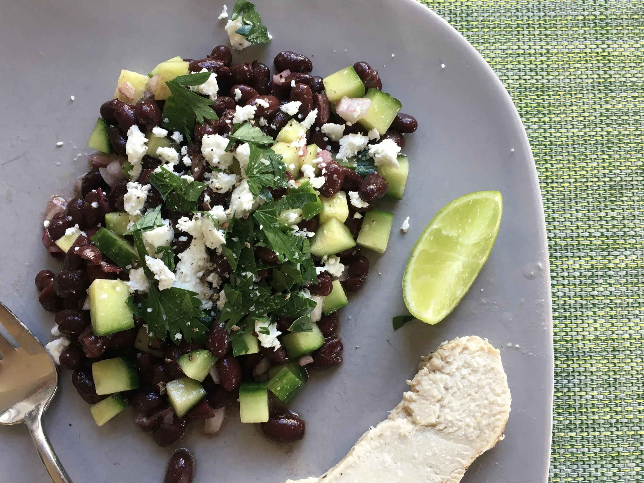 I try new salads from recipes I’ve gathered in and the occasion for this one was the first cucumber. Garden parsley, red onion and lime juice with canned black beans was a quick fix on a warm day.