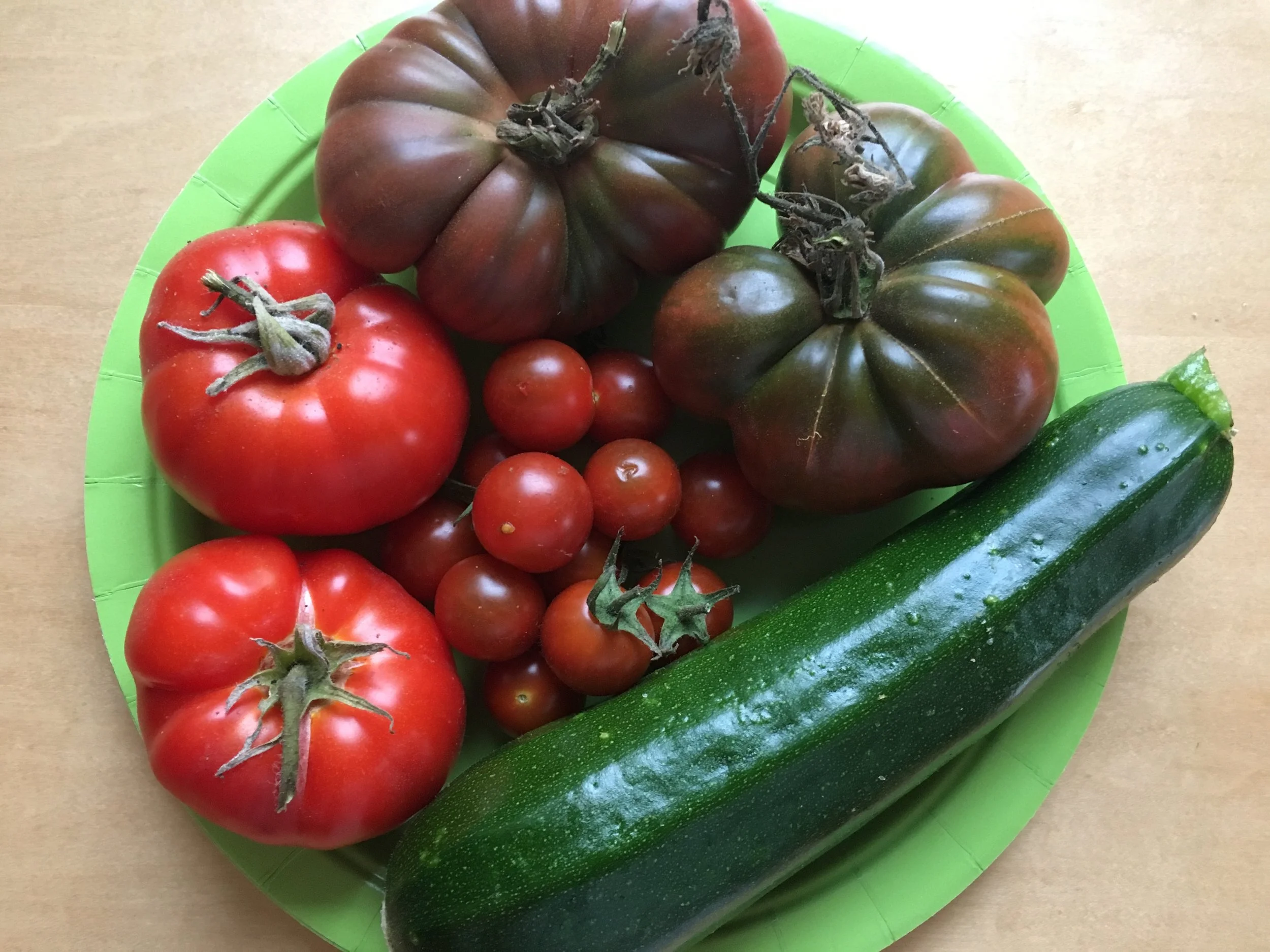 With zucchini coming on strong and lots of tomatoes I had plates of veggies to share with neighbors and friends. I’m also caring for a neighbor’s very productive garden for three weeks and distributing her harvests.