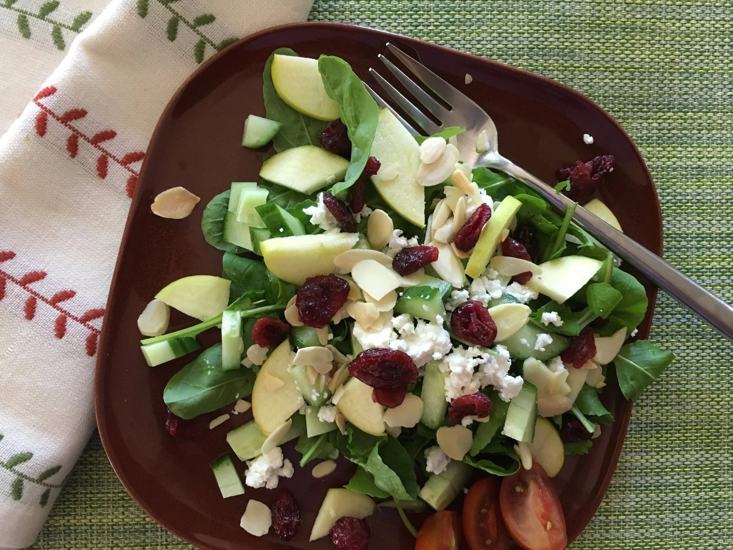 An arugula salad is a lunch favorite, here with my garden apples, diced cucumbers, dried cranberries, goat cheese and sliced almonds.