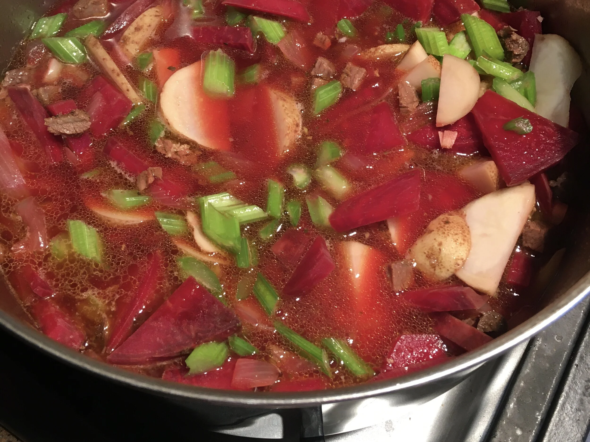 With the addition of other garden vegetables a hearty beet borscht simmered and with biscuits made a perfect winter dinner. My recipe is a take on the beet borscht in the original Moosewood Cookbook.