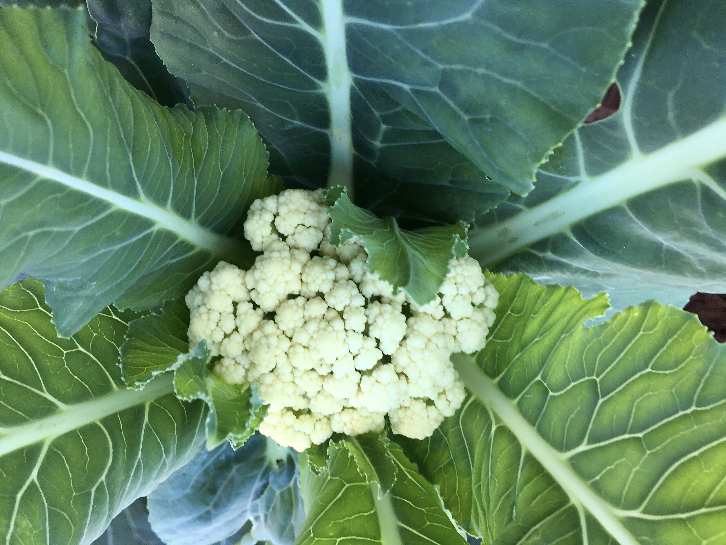 This is a paltry cauliflower head before harvest. Damage inflicted by the raccoon robbed the plant of its vigor despite extra fertilizer. I’m remembering my usual heads that are typically eight inches across. And this little one escaped my notice and spread.