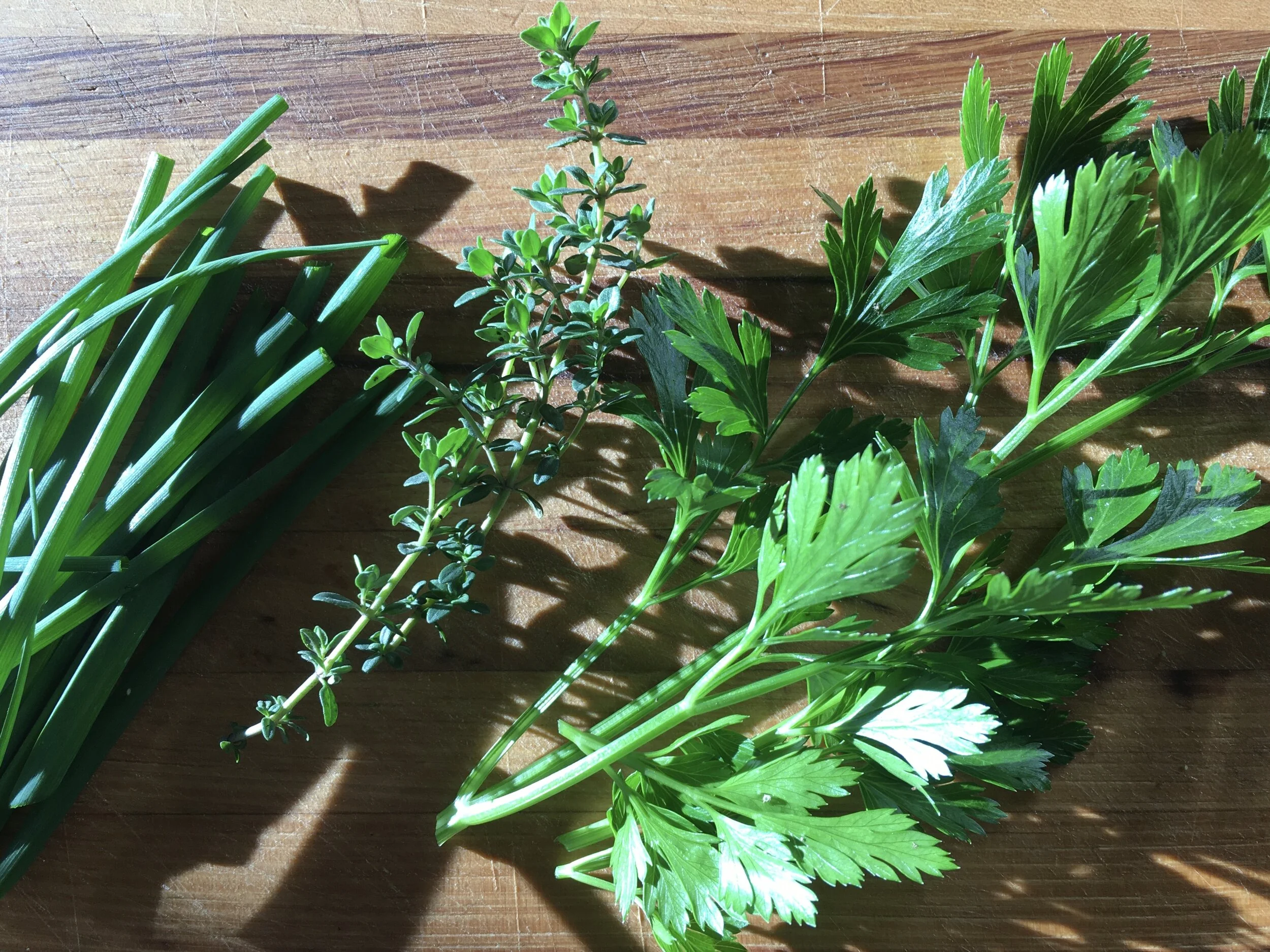 Gathering some herbs—chives, thyme and parsley for soup reminds me how essential they are in my kitchen. I rarely use dried herbs and now the sage and oregano show a spring surge.