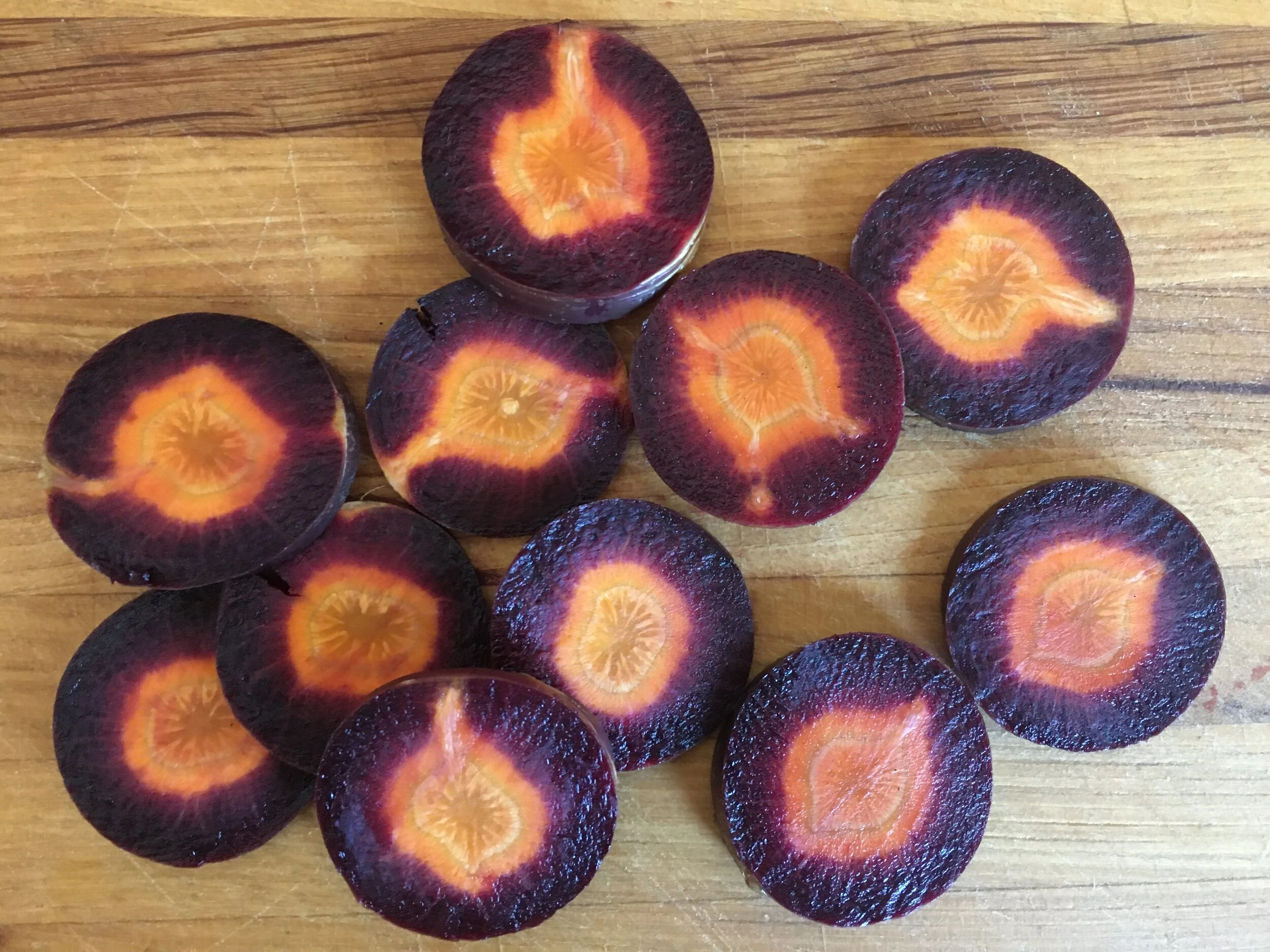 Inspiration for the purple theme came from the recent harvest of ‘Purple Rain’ in the tricolor carrot mix at Renee’s Garden. I’ve grown other purple carrots but like the strong contrast of the purple and orange portions. And they taste like I think a carrot should.