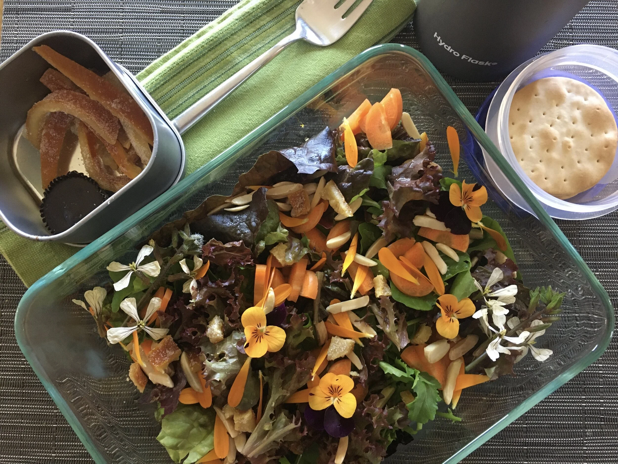 Last week we met up with family for a neighborhood, socially-distanced picnic. The orange theme was working that day with calendula petals, carrots, violas and candied orange peel.