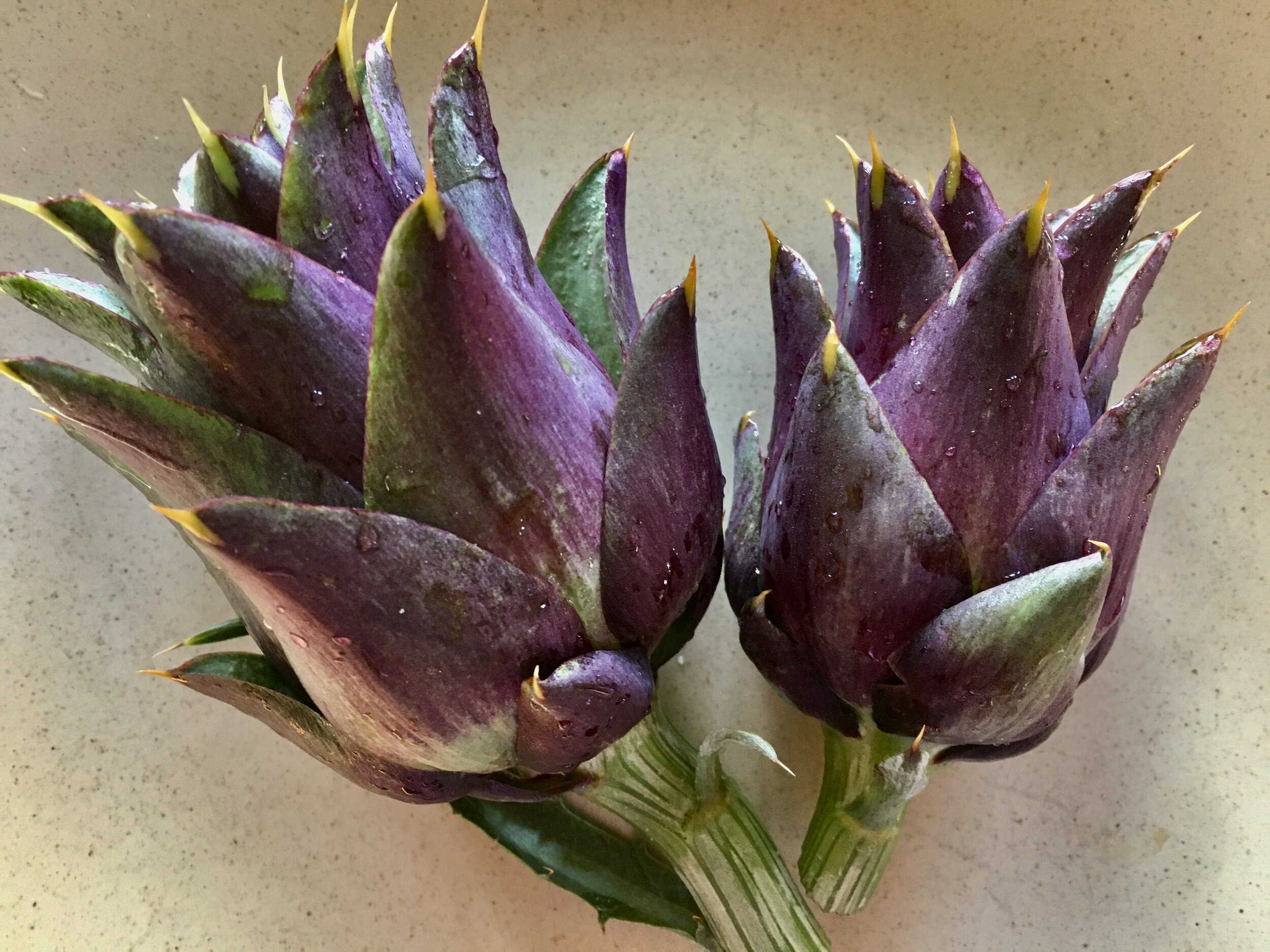 One of the purple artichoke plants is in my street side garden. The wicked thorns and prickly stems deter anyone who might consider taking one home for dinner. Lately, we’ve had artichokes almost every night. Isn’t that the way with growing your own food? You relish the season, eating heartily of what’s abundant.