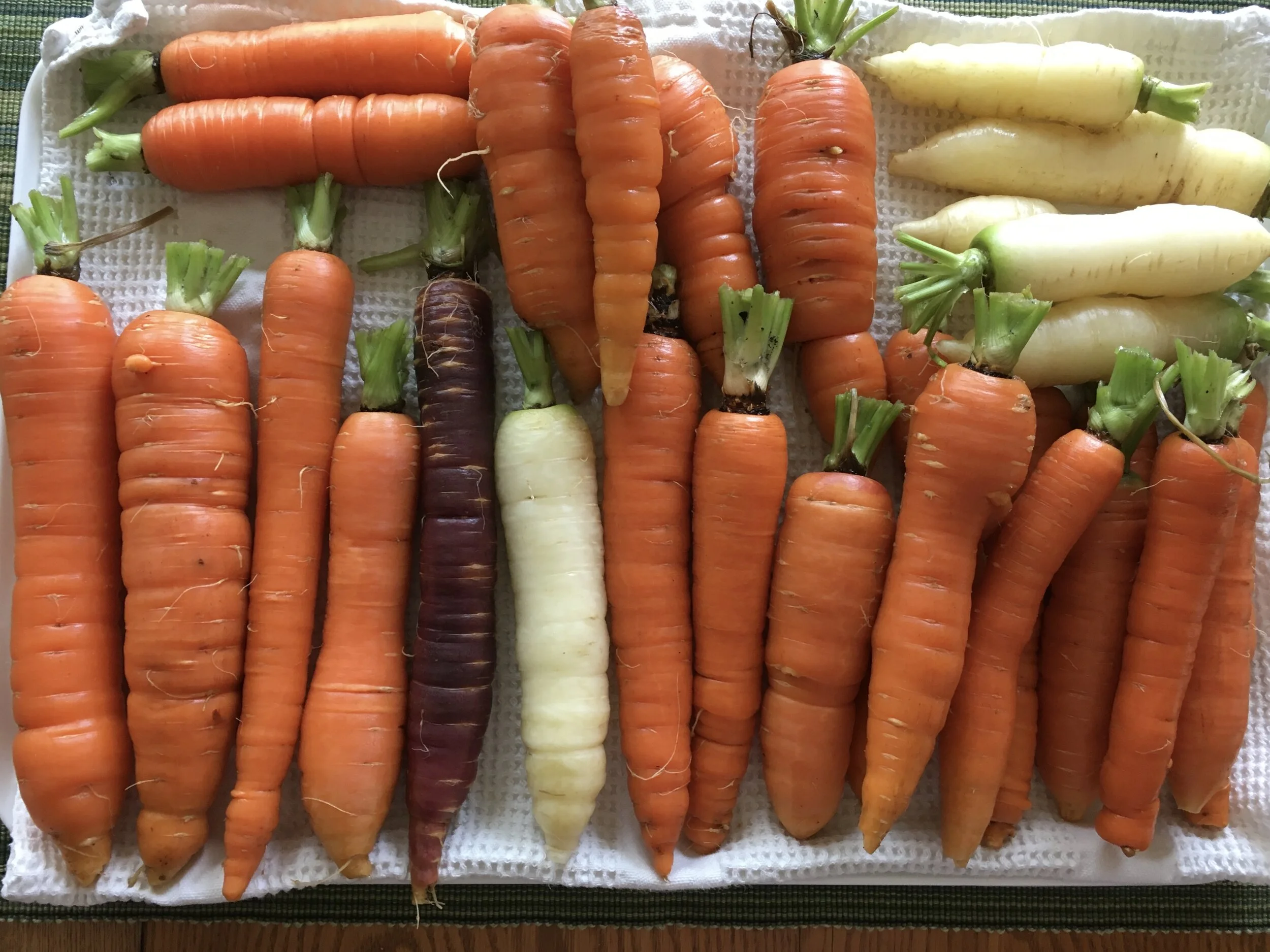 This is about a third of the carrot harvest. I’ve been pulling them all along at various sizes. There were more smaller carrots and this week’s take was 7 pounds. About ten percent of the crop remains, soon to make room for the corn. With all the rain this was definitely the best season for carrots in many years.