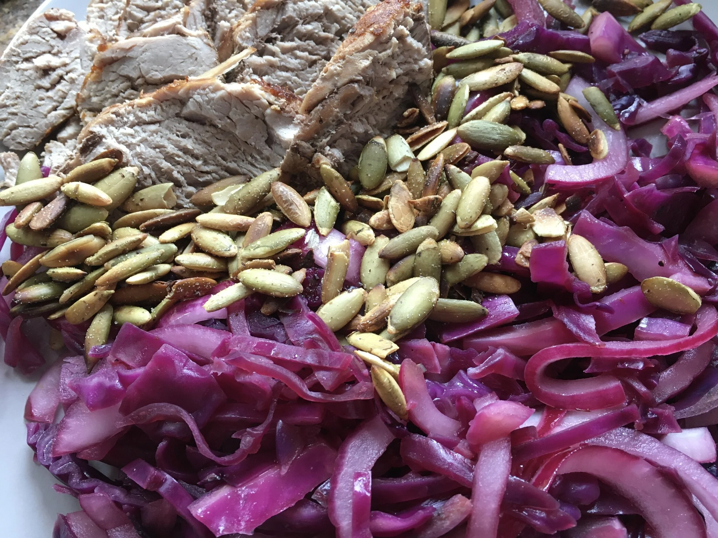 A seasonal favorite marked the end of the season (and Father’s Day)—Pork and Red Cabbage Skillet. Red onions tossed with apple cider vinegar and salt are stirred into the cabbage just before serving. Toasted pepitas add crunch and color.
