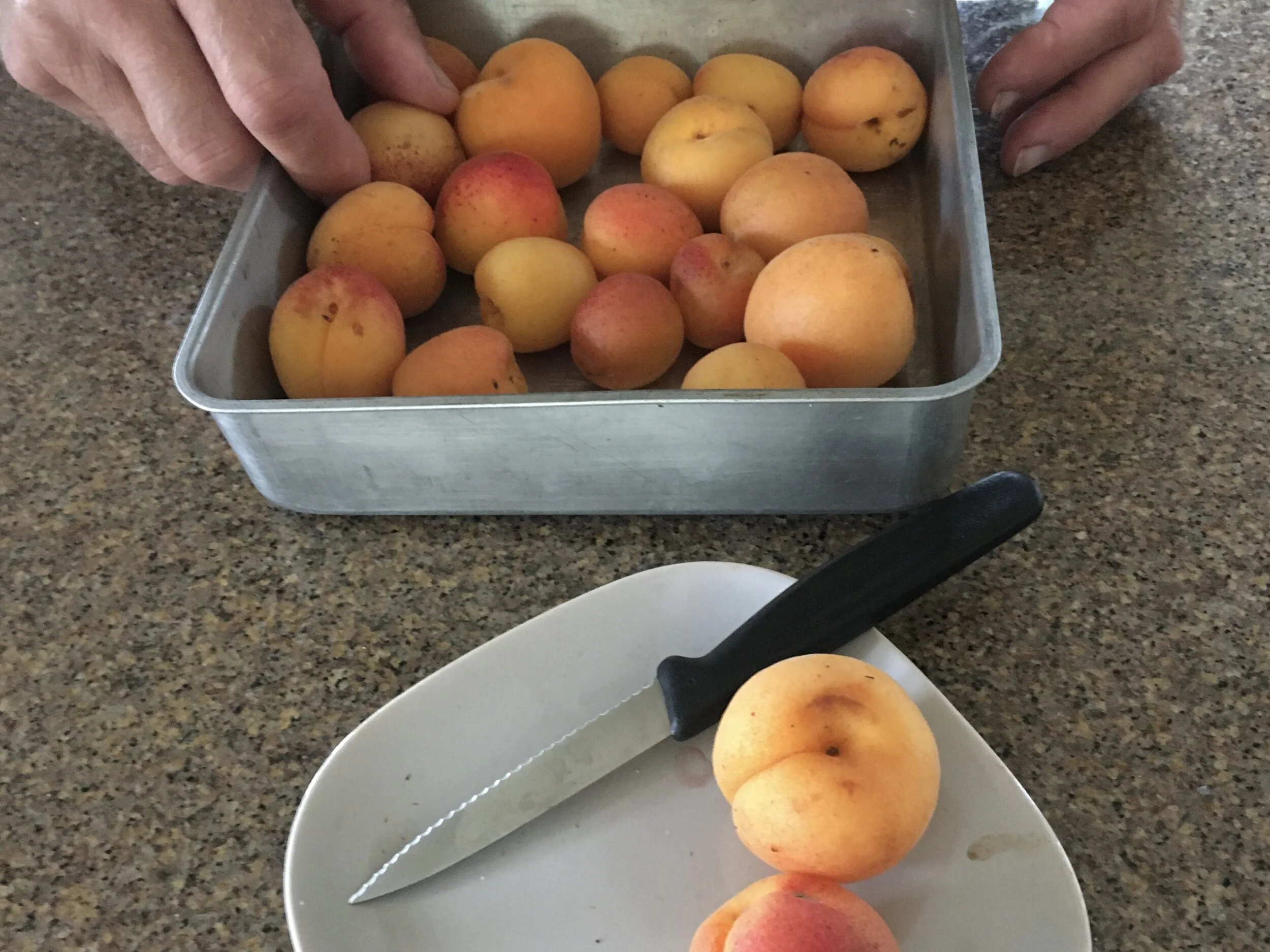 My husband did a patient daily sort of the remaining apricots last week, setting out those that needed to be eaten “today.” We were both sorry to consume the last of the 78 pounds harvested this year.
