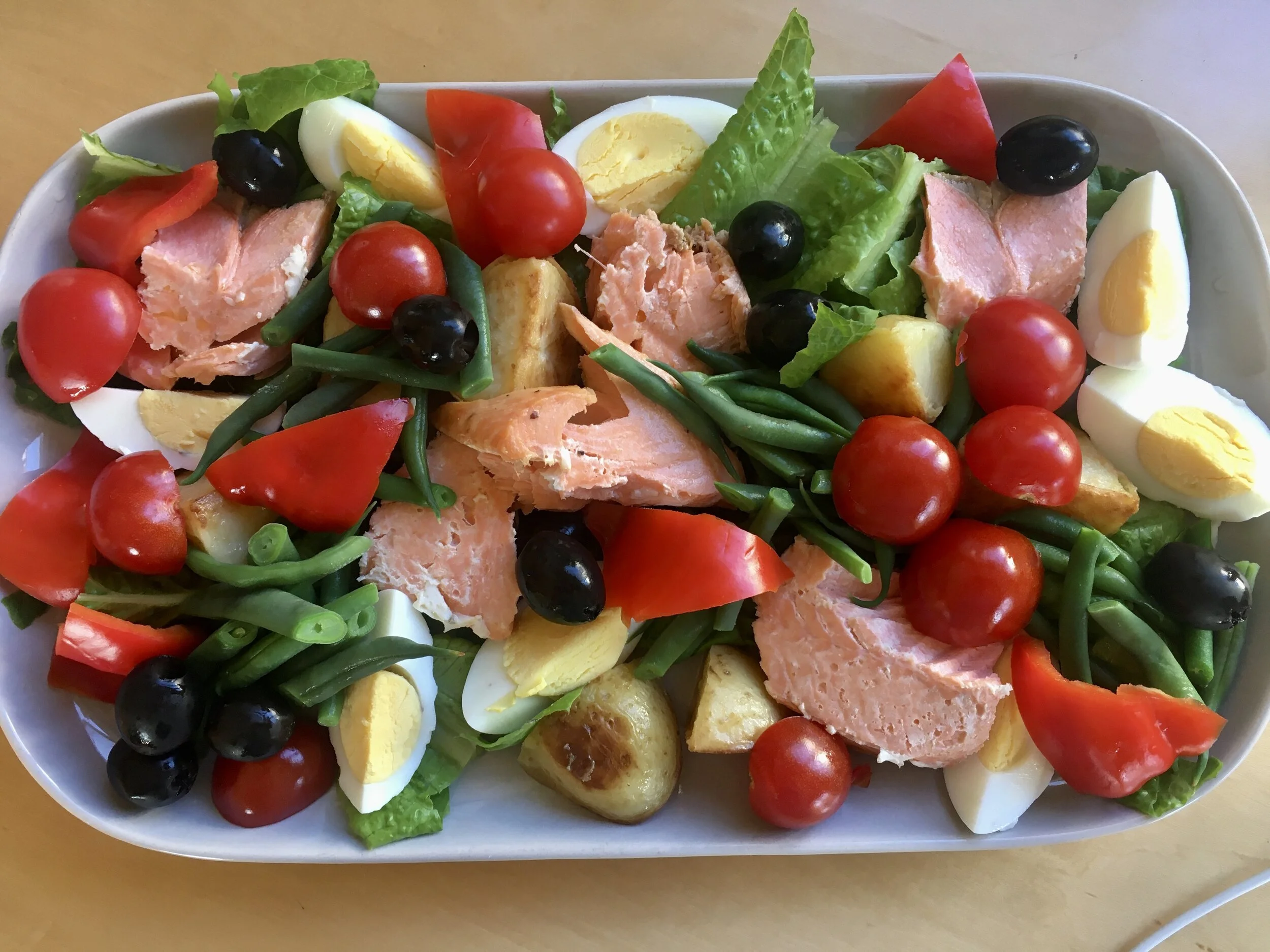 Here, leftover salmon, joins with the last of the ‘Jericho’ lettuce, tomatoes from a neighbor and my green beans for my riff on a nicoise salad.