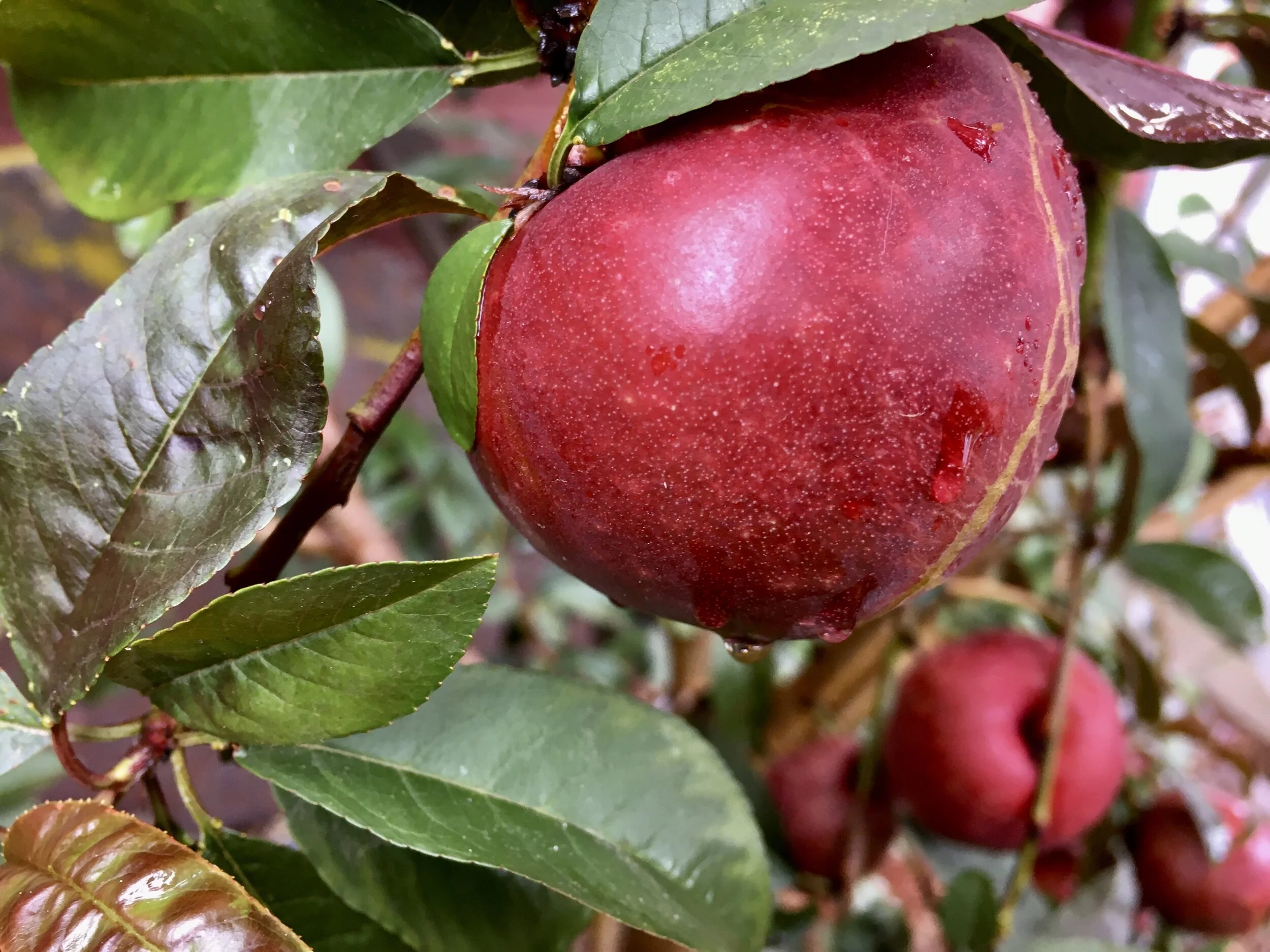 The nectaplum tree is laden with fruit that will be ready soon. More about this fruit when we begin the harvest.