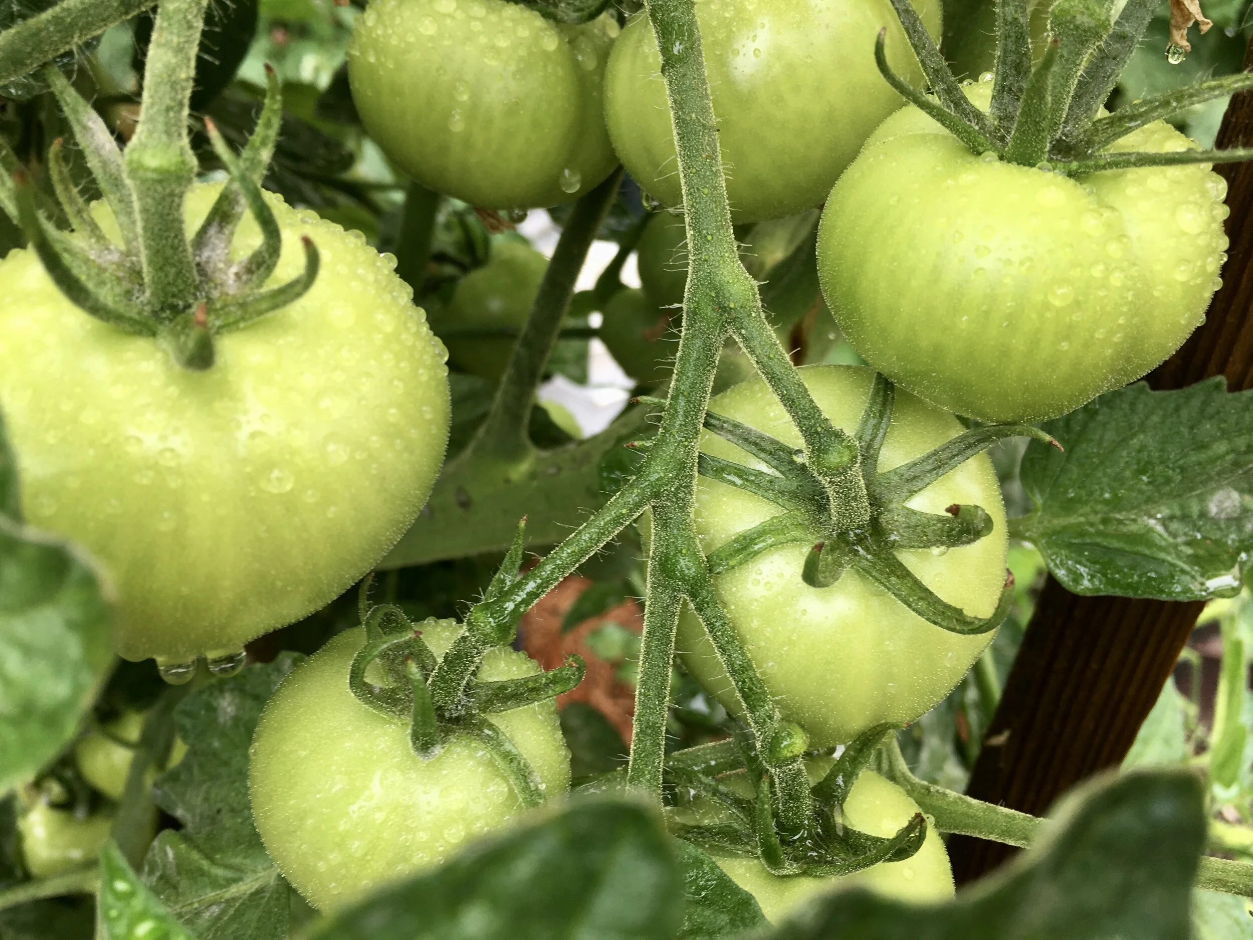The ‘San Francisco Fog’ tomatoes are coming along but would like a break from the May gray and June gloom.