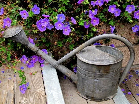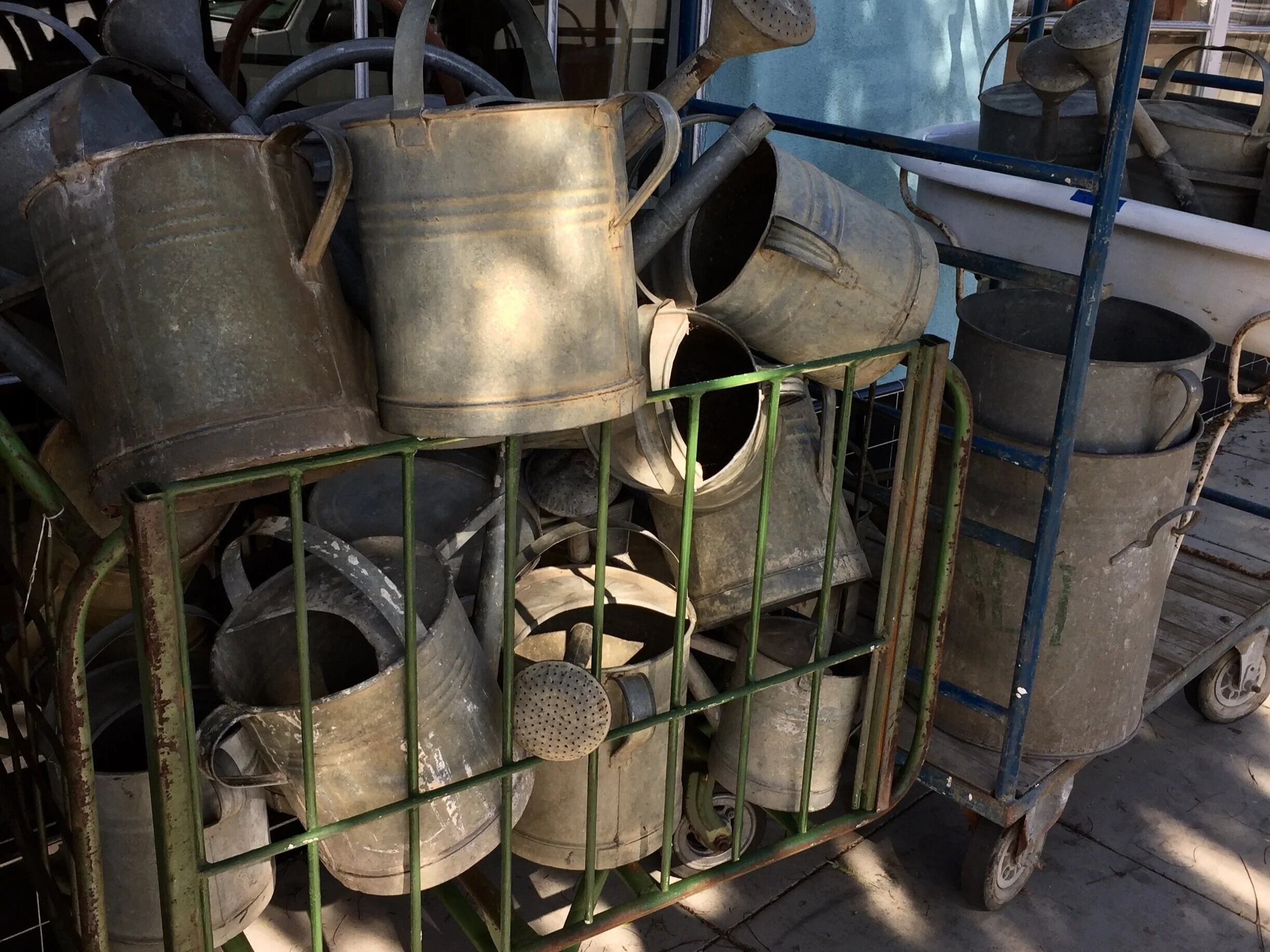 Imagine my delight when I visited Architectural Salvage in San Diego a few years ago. The owner was traveling in Eastern Europe and shipped back to San Diego a container of watering cans. As I stood in front of the shelves and carts of watering cans, I pondered the varied designs; thought about the hands that had used them, and the gardens and farms they nurtured.