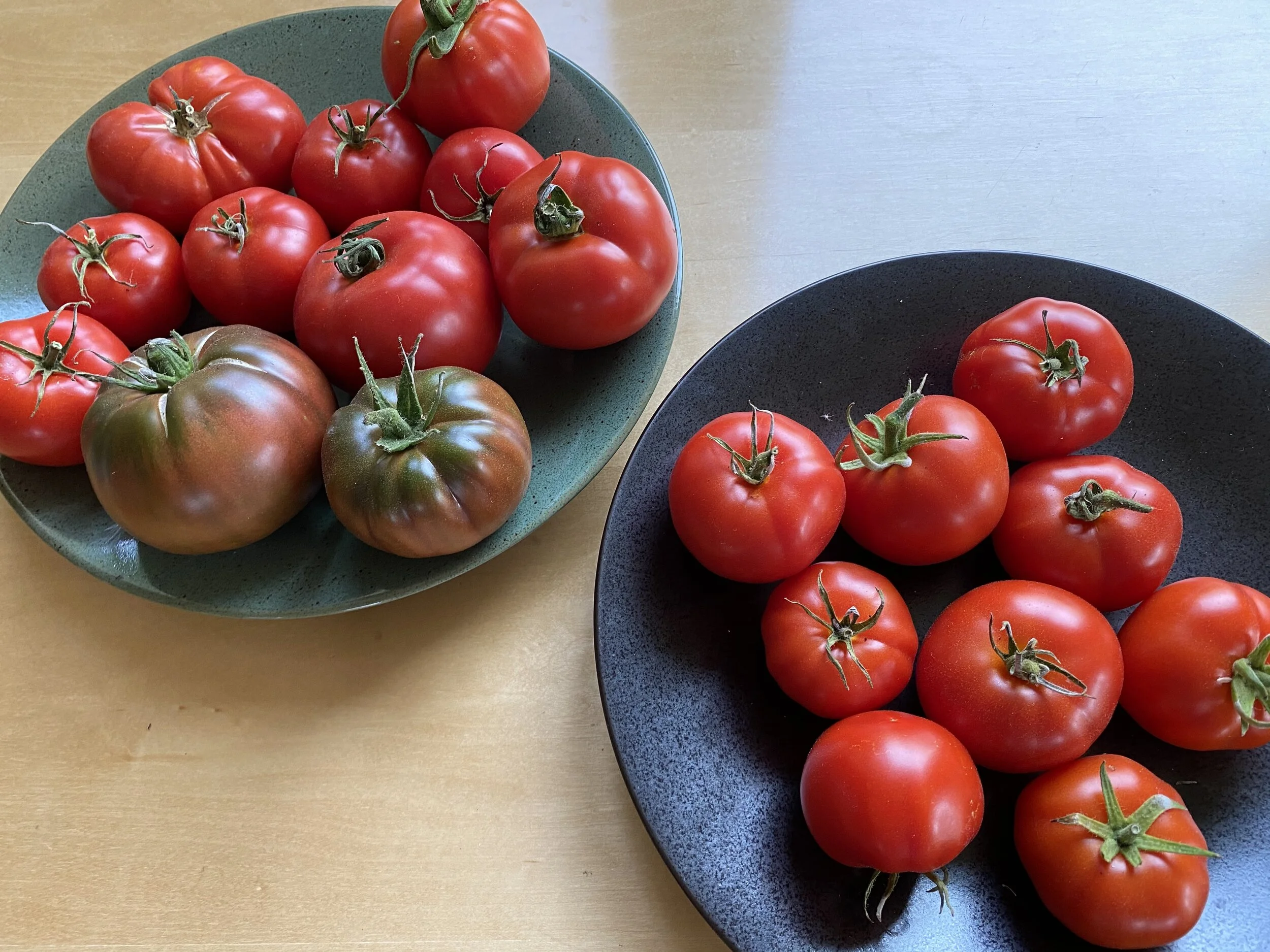‘Early Girl’ and ‘Stupice’ do acceptably most years. ‘San Francisco Fog’ on the right stood in for ‘Stupice’ this year. It is similar to ‘Early Girl’ but smaller in my garden. The ‘Early Girl’ tomatoes are on the left plate next to the ‘Black Krim,’ my favorite tomato; though Cherokee Purple might be close. ‘Black Krim’ seems to split less for me but I plan to try Cherokee Purple again next year.