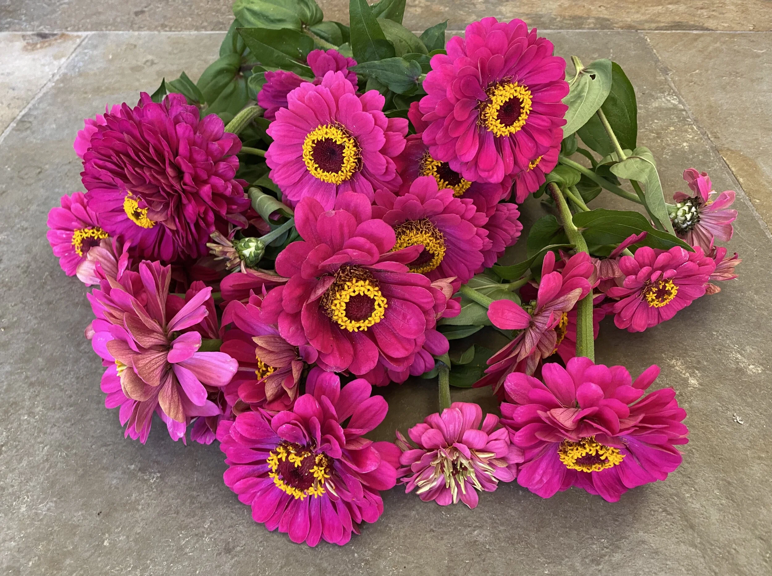 I always grow zinnias with the summer vegetables. This year they have the corn as their backdrop in a small 2 x 4 foot patch. Last week I picked 28 hot pink zinnias. The week before it was a preponderance of orange ones. I left the red, light pink and orange zinnias for another day.