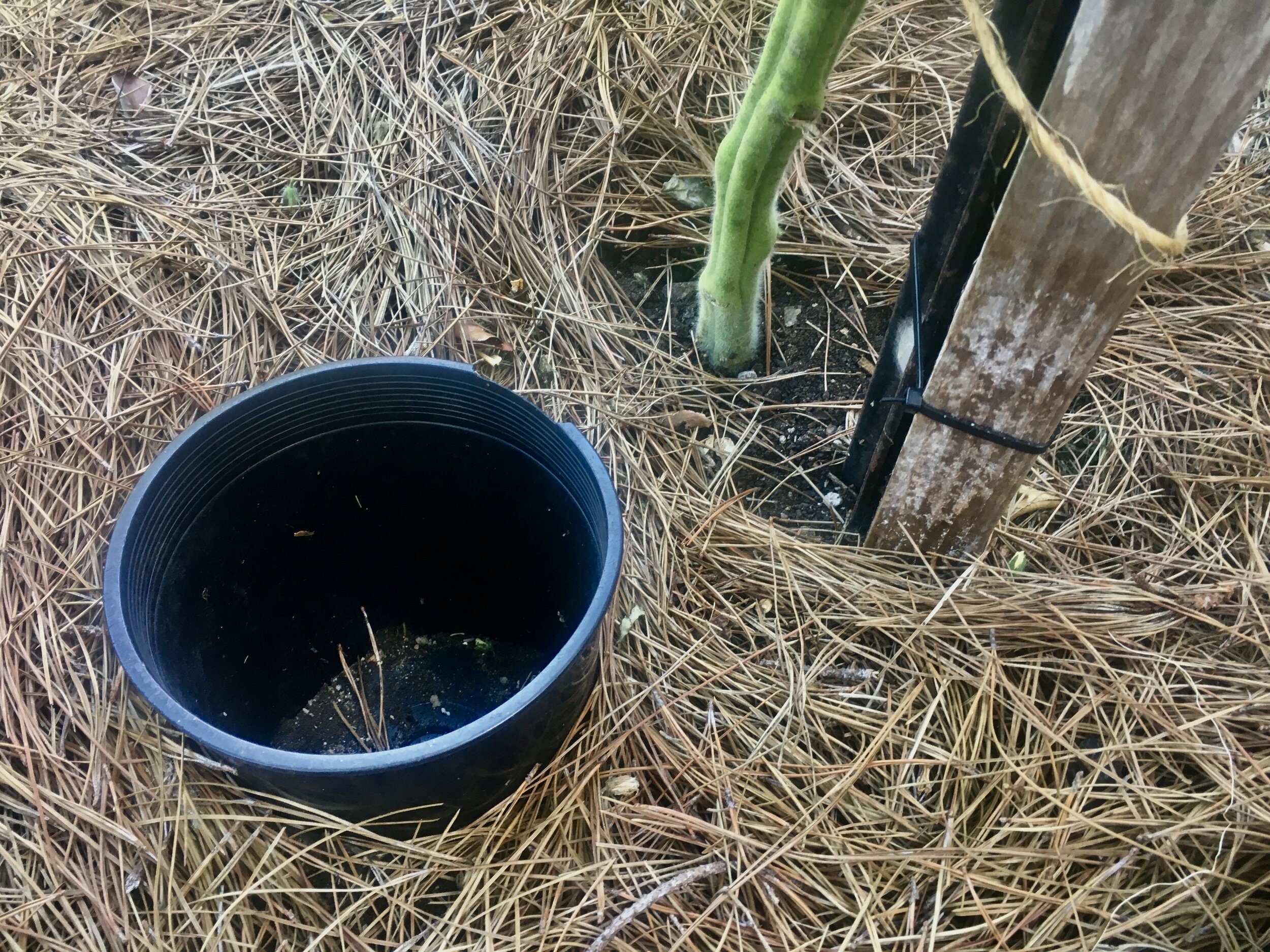 Irrigating tomatoes in a sunken gallon pot keeps water from splashing on the leaves. Here you can see the lowest tomatoes leaves trimmed up.