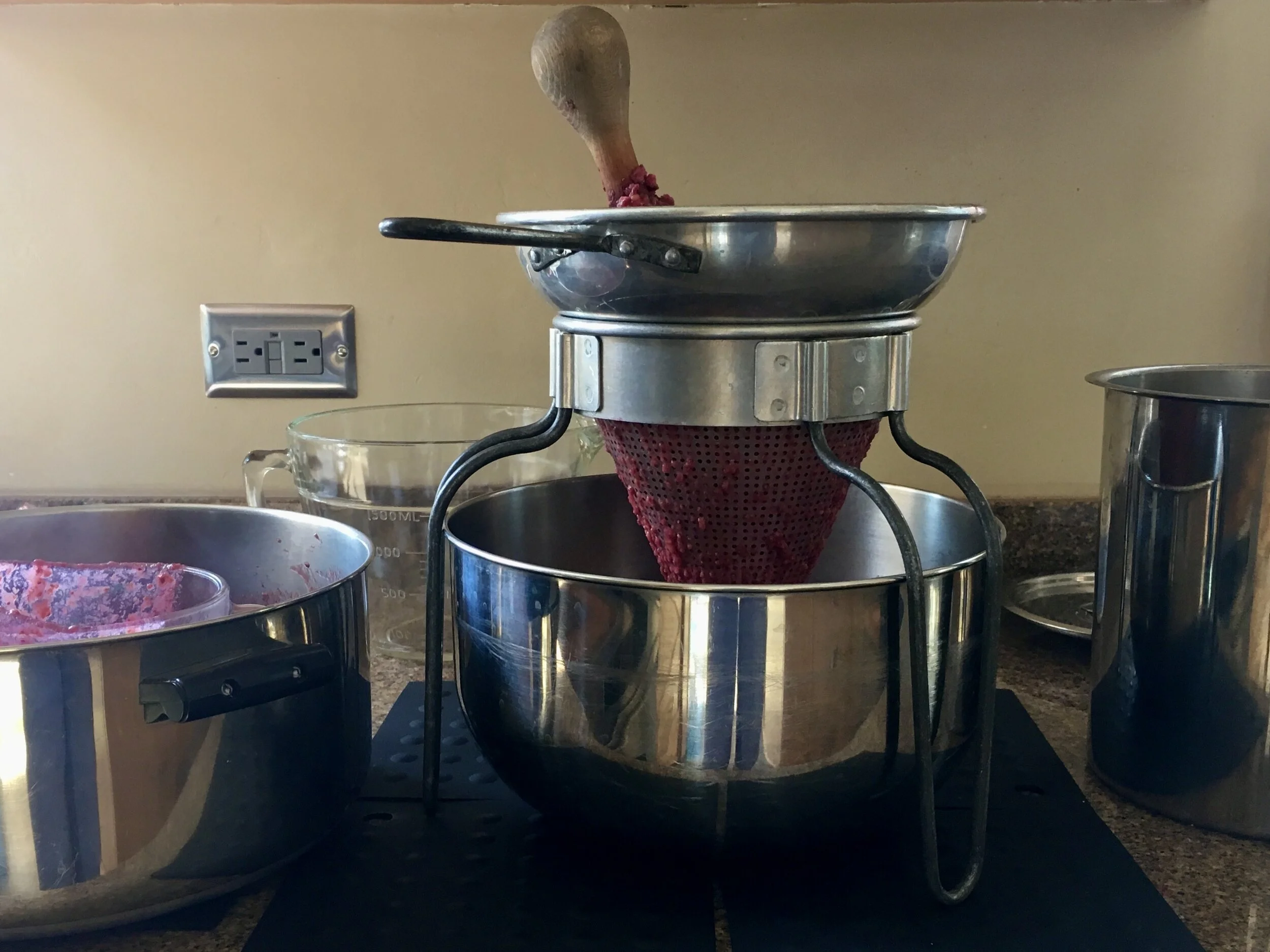 When the guavas have cooked down with a little water for about fifteen minutes, I use the immersion blender to reduce the larger chunks of fruit. Then the mixture is ready for my grandmother’s chinois which makes quick work of the transformation to guava puree.