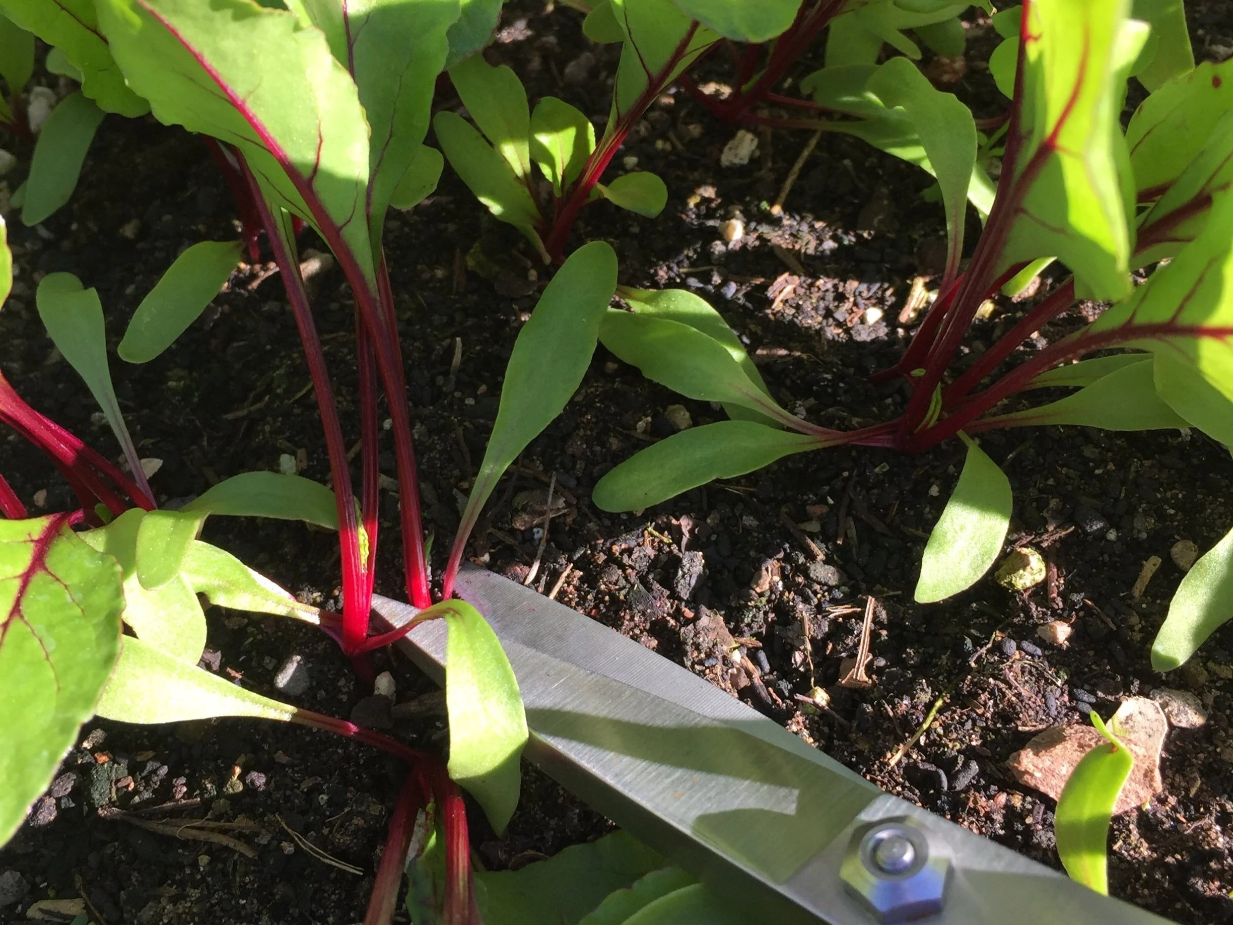 Thinning beets can be tedious but sharp scIssors help. I select the sturdiest in the seed clump and snip the others with scissors. Sitting on a little garden bench, I snipped away and when I finished It was lunch time.