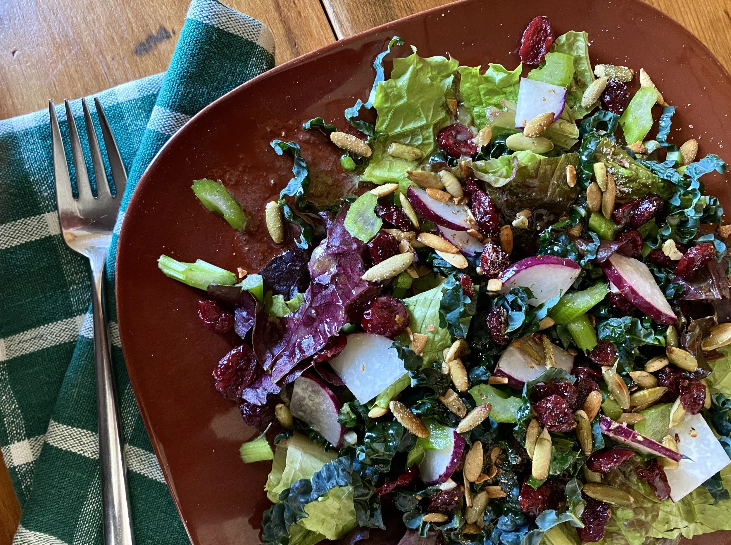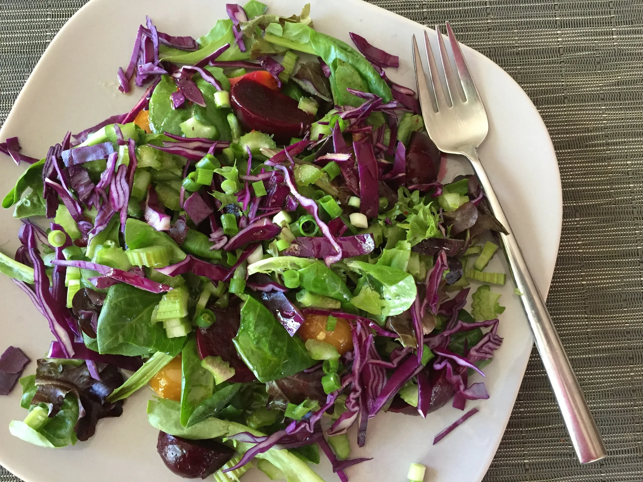 My salads are artistic compositions with varied colors and textures. Dressings come together with citrus juices, various vinegars and extra virgin olive oil. Nuts and crumbled cheese add substance sometimes. Be inspired as you survey your winter garden or make selections in the produce aisle.