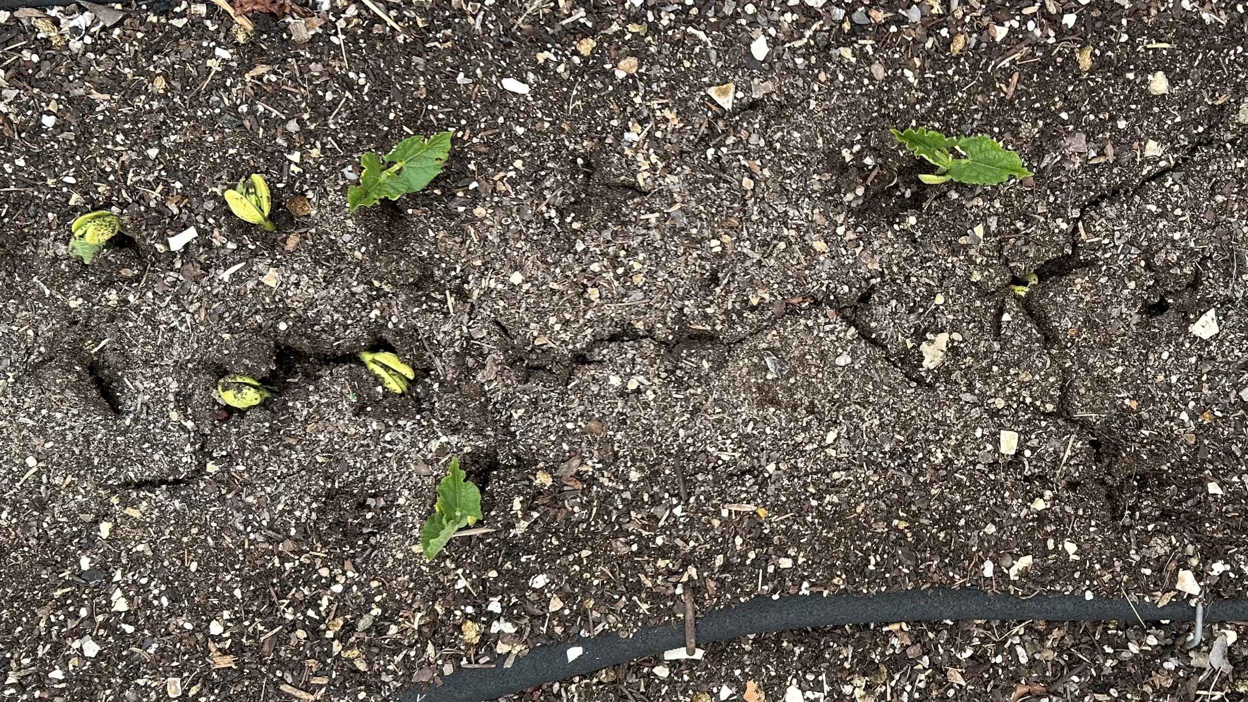 See the power of seeds as the cranberry beans emerge through the crusted garden soil.