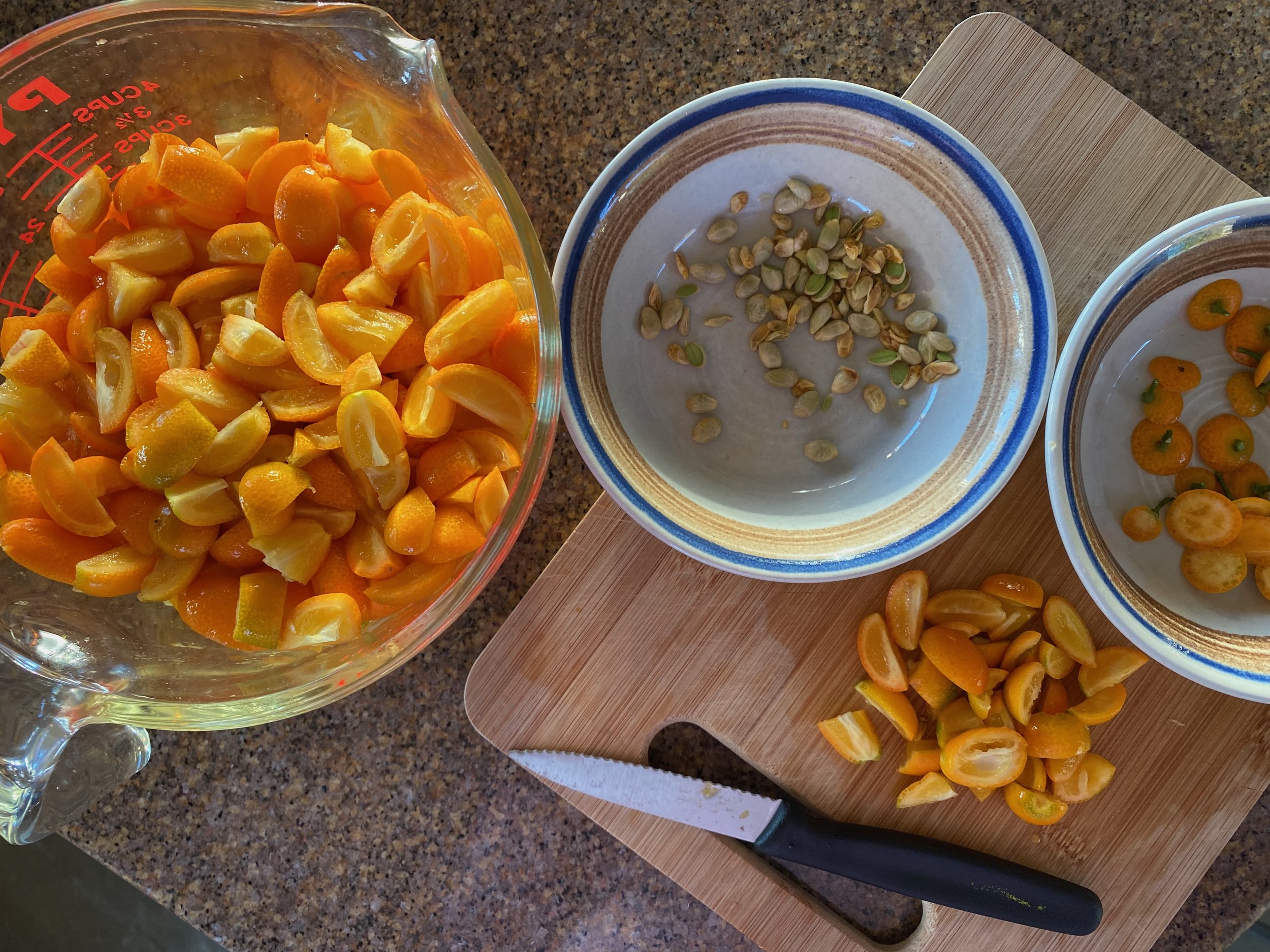 There are several hundred Nagami kumquats still on the tree. Plans include kumquat syrup and Snacking Chocolate with Roasted Kumquats and Pepitas. Thankfully, they also store well in the fridge and become quick, punchy salad additions.